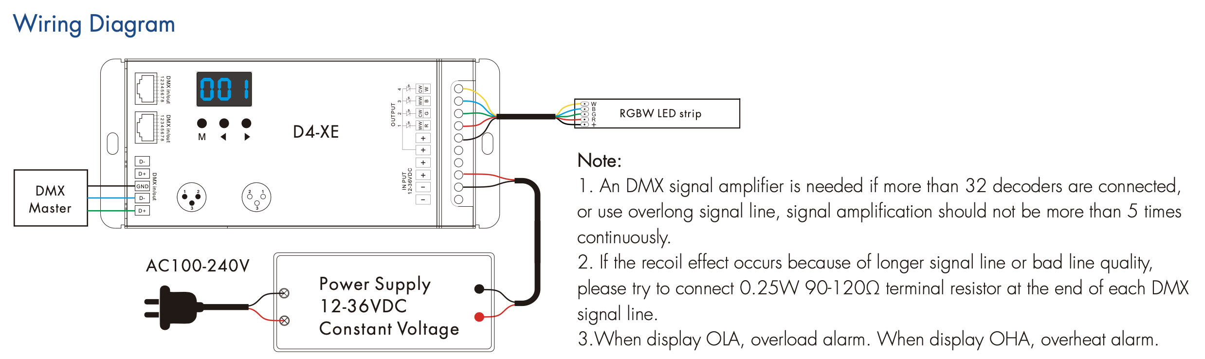 - Samodzielny tryb RGB/RGBW oraz tryb 4-kanałowego ściemniacza do wyboru, które są sterowane przyciskami z wbudowanymi programami, zamiast sygnału DMX