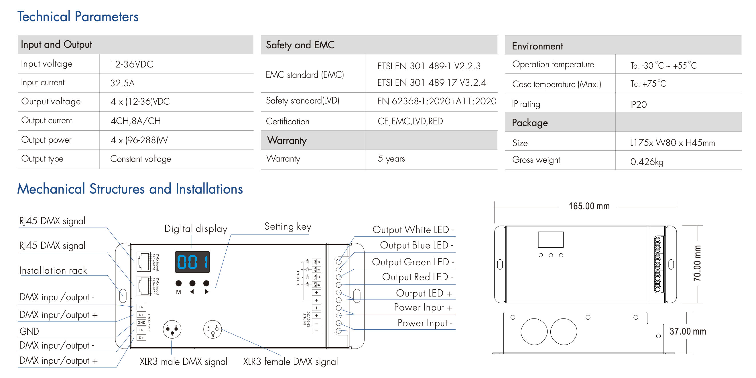 - Możliwość wyboru wyjścia 1/2/4 kanałów DMX