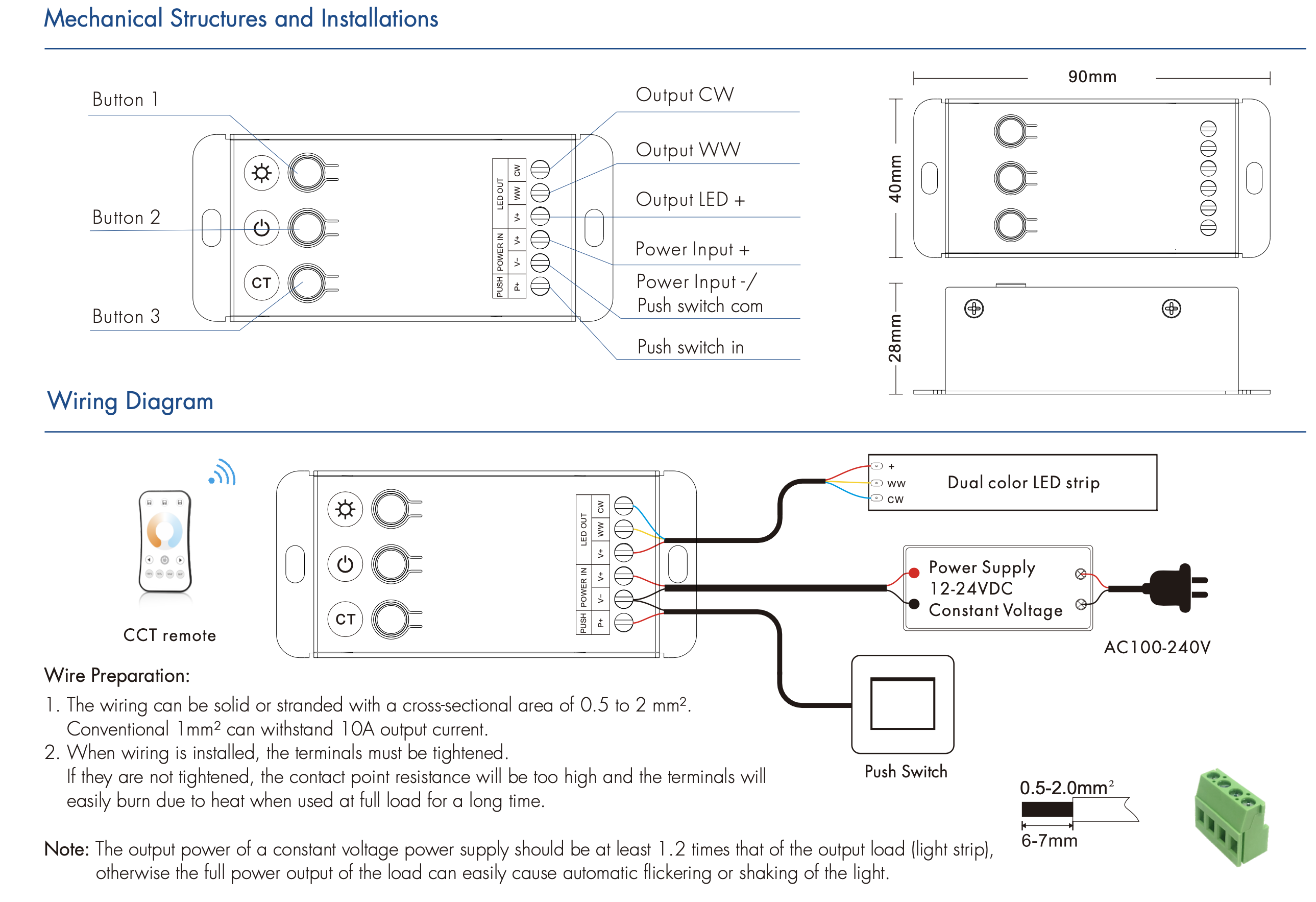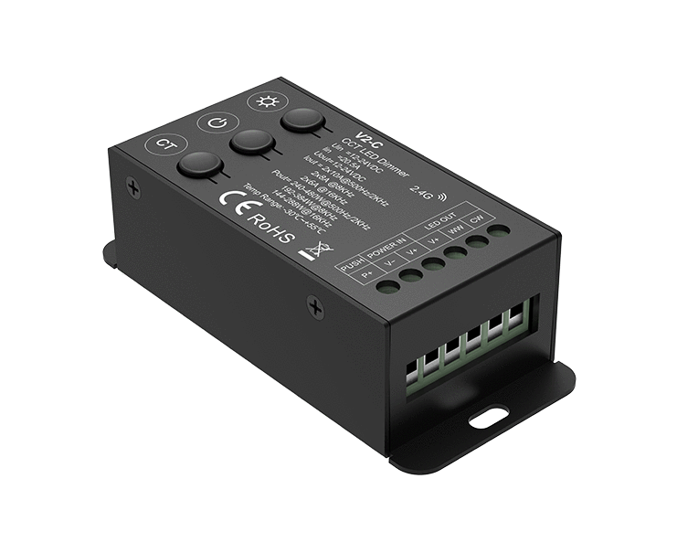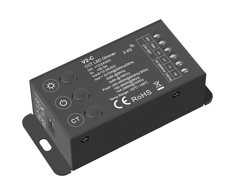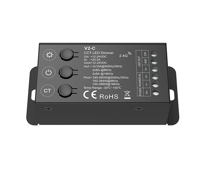 Dwukanałowy radiowy sterownik-ściemniacz LED V2-C służy do sterowania oświetleniem LED o zmiennej temperaturze barwowej (taśma LED CCT lub dwie taśmy LED cięplej i zimnej barwy)