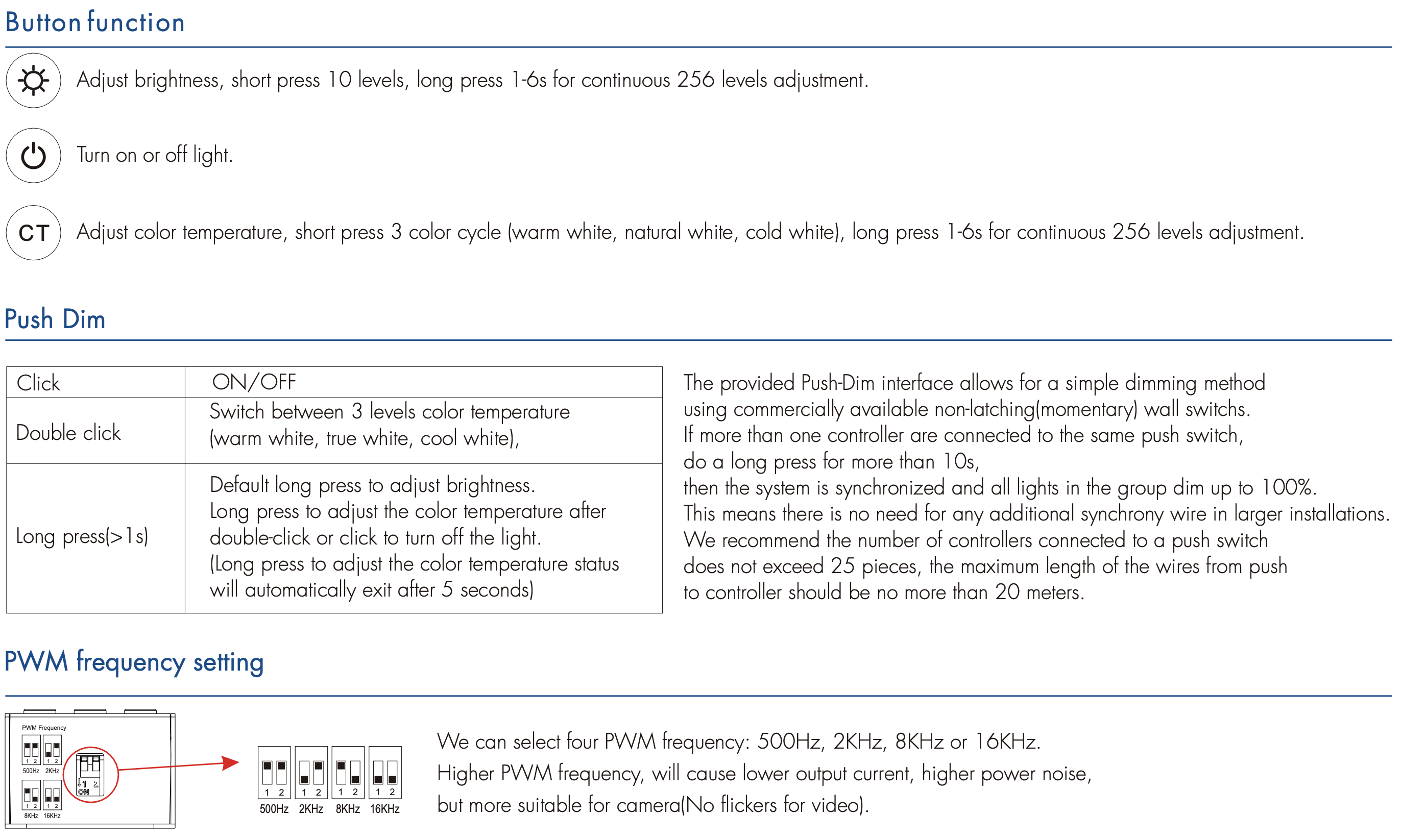 • Częstotliwość PWM do wyboru 500Hz, 2kHz, 8kHz lub 16kHz.