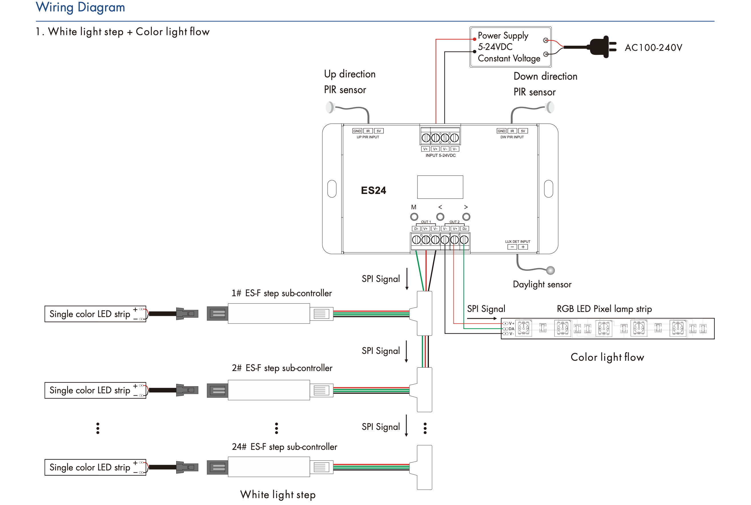 - Grupa 1 wyjście sygnału SPI do realizacji kontroli białego światła na stopniach lub kolorowego światła na stopniach. Domyślnie jest ustawiona kontrola białego światła na stopniach, używana z podkontrolerem kroków ES-F do realizacji kontroli każdego stopnia z paskiem białego światła