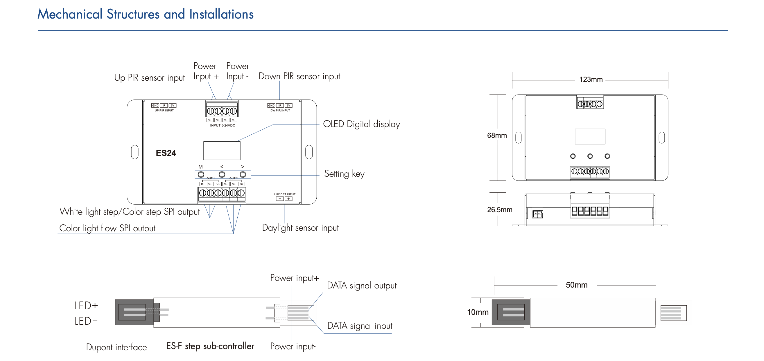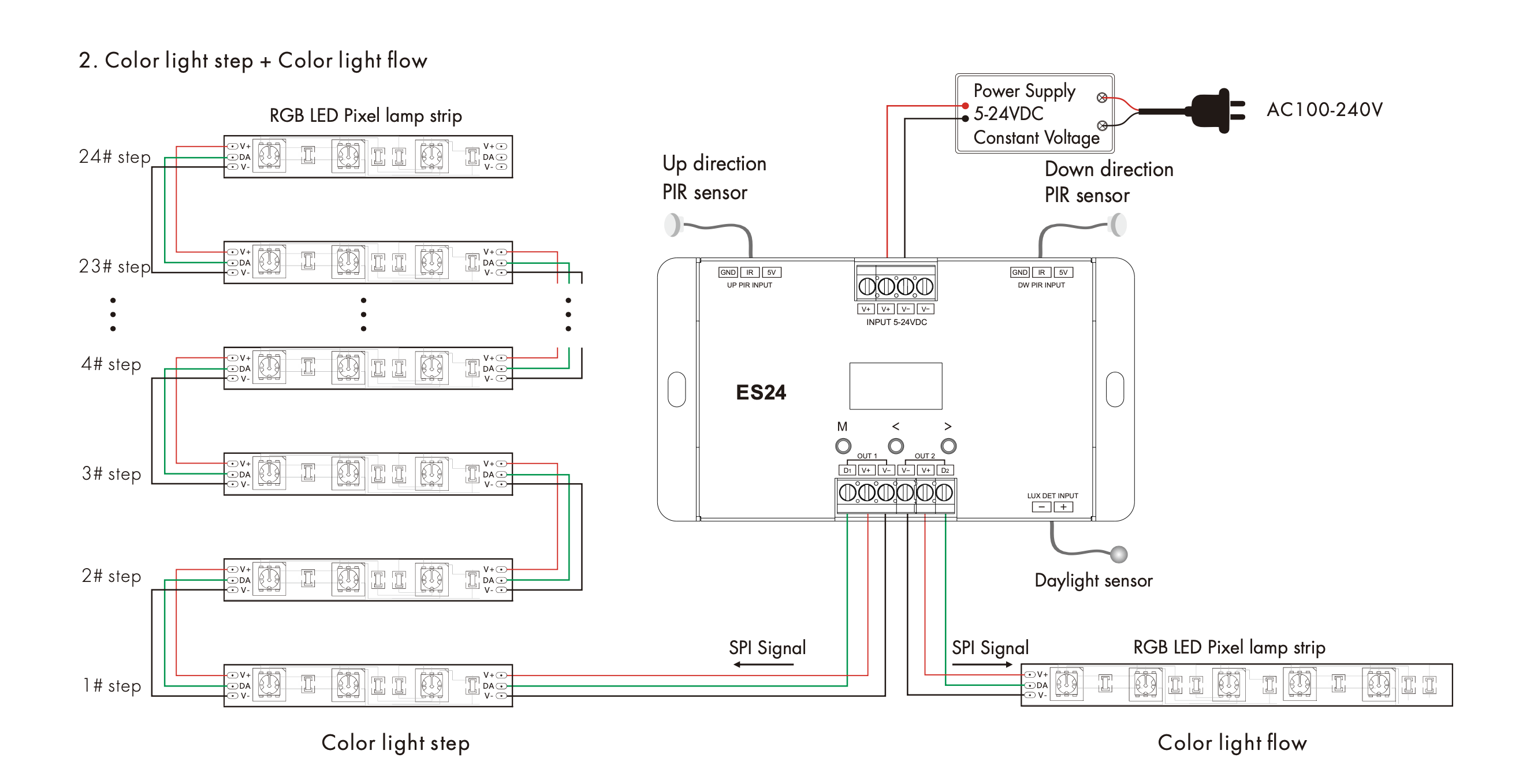 - Wielofunkcyjny kontroler oświetlenia schodów z czujnikiem PIR posiada czujnik światła dziennego oraz dwie grupy różnych wyjść sygnału SPI (TTL)