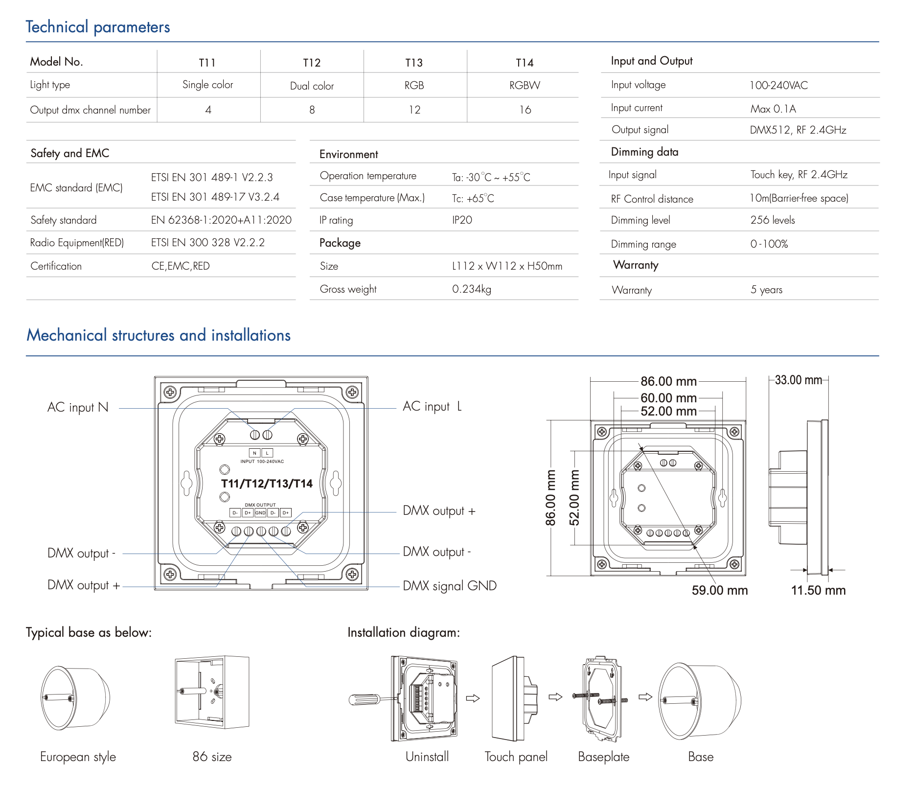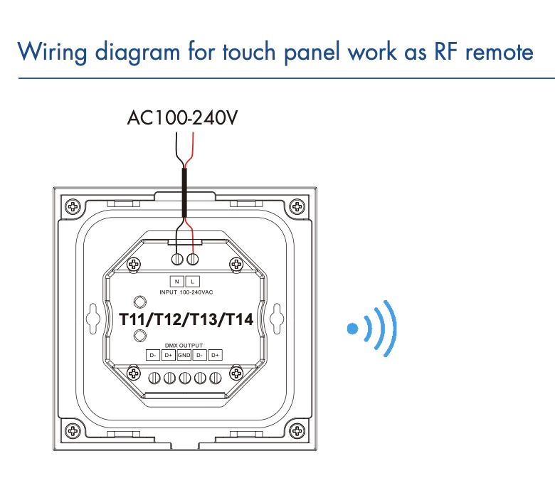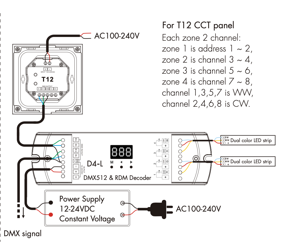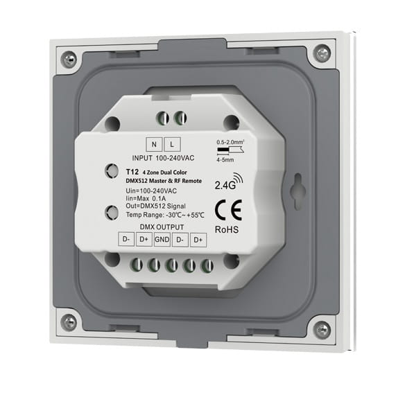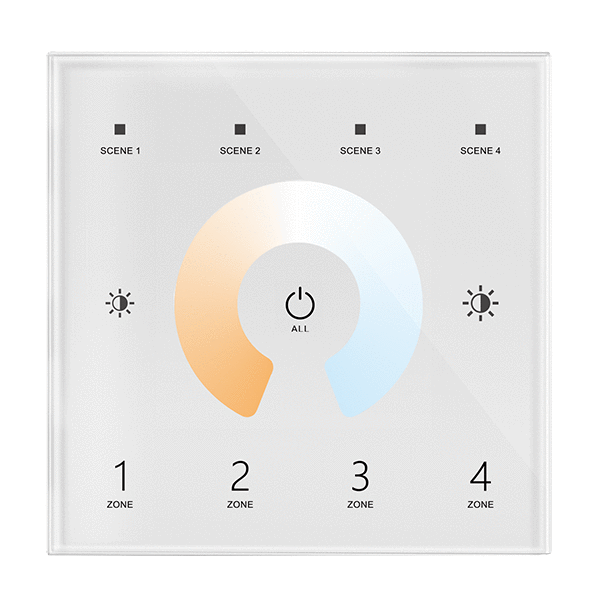 - Panel dotykowy 4 strefy 2 kolorówy DMX512 master, może być również używany jako 4-strefowy 2 kolorowy pilot RF