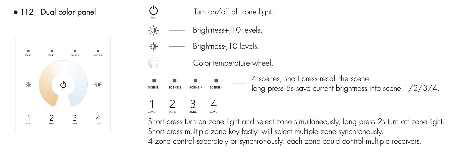 T12(W) Panel LED RF+DMX512 CCT Dotykowy 4-Strefowy