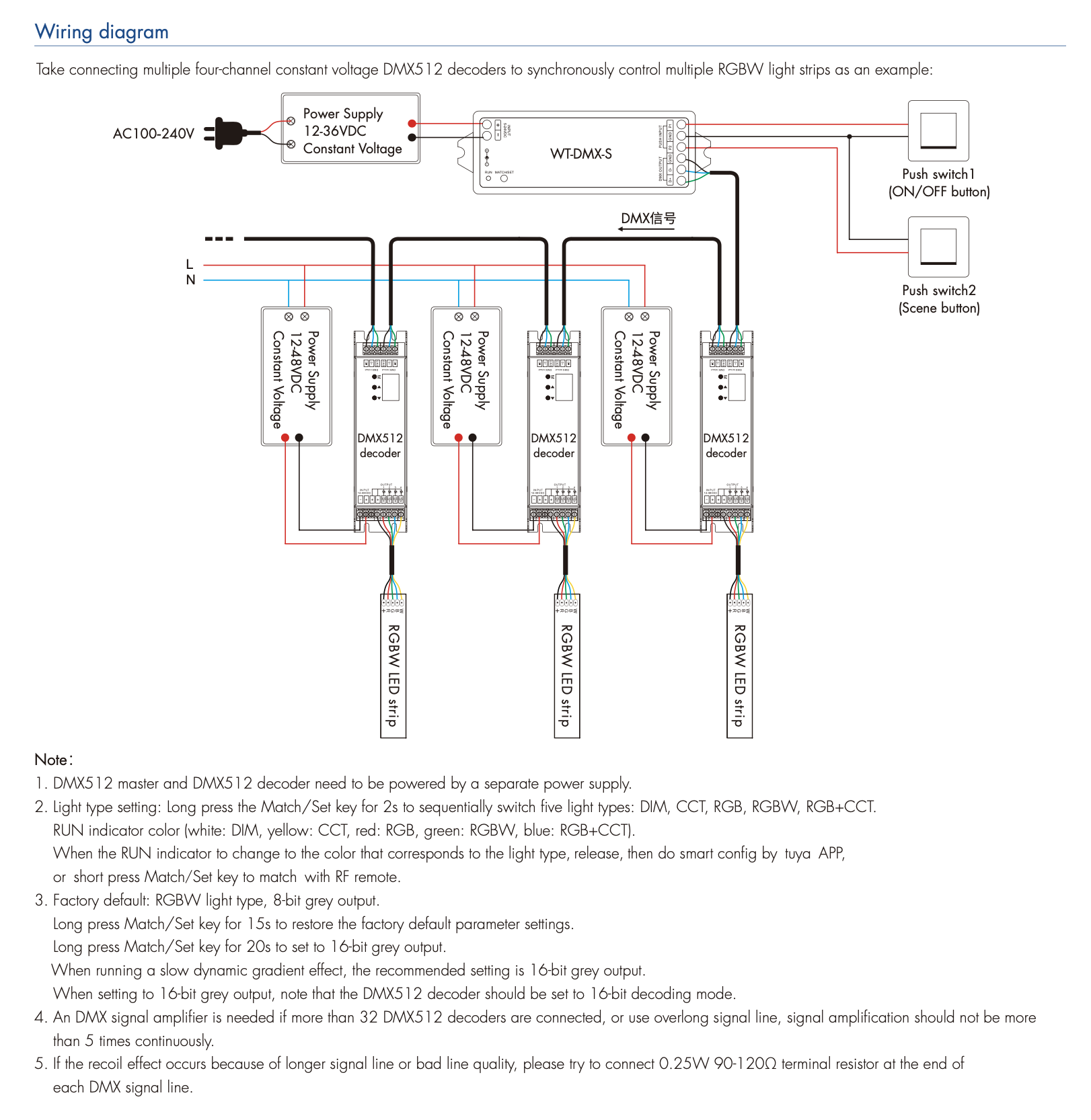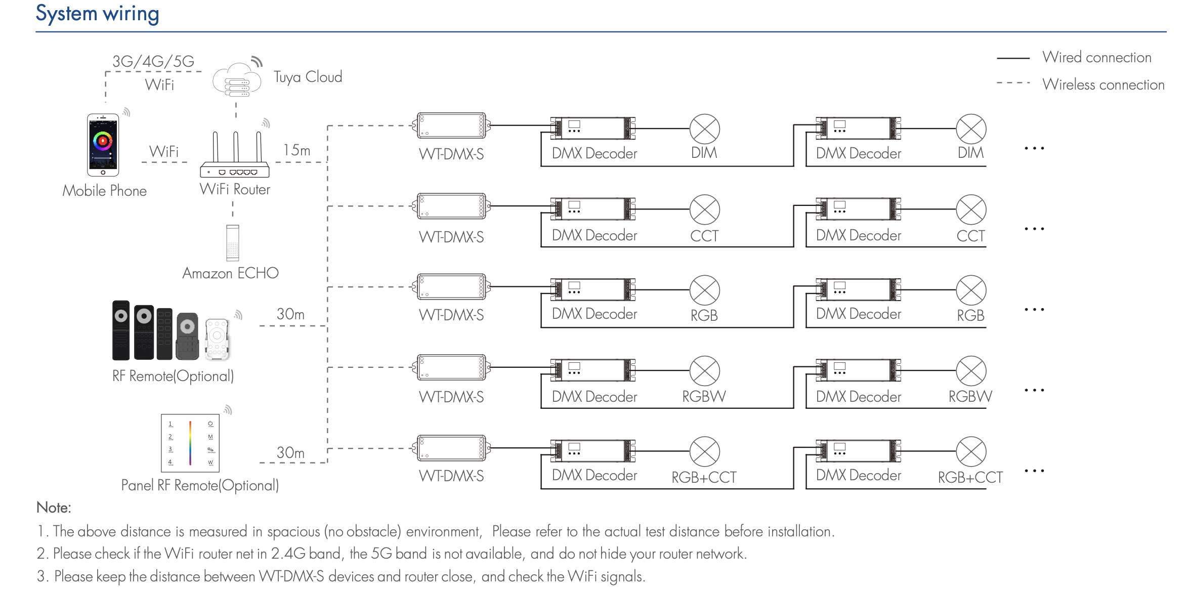 • Konwerter WiFi/RF-DMX512: Każdy sterownik WT-DMX-S może działać jako konwerter WiFi/RF-DMX512, umożliwiając używanie aplikacji Tuya do kontrolowania jednego lub więcej dekoderów DMX512 dla zsynchronizowanego sterowania na długie odległości