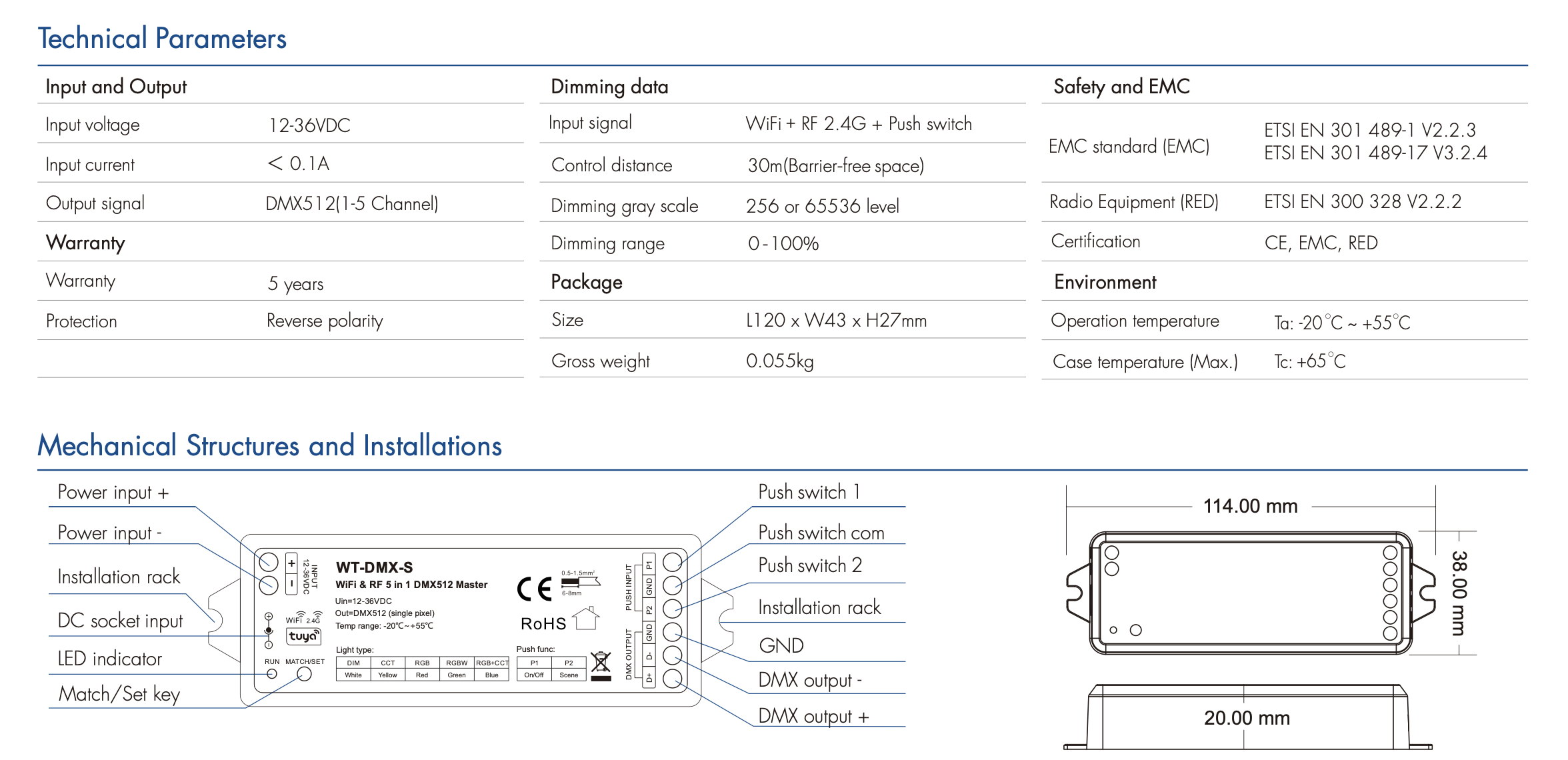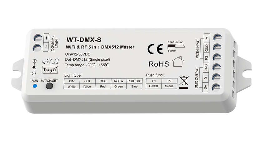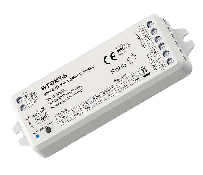 Sterownik WT-DMX-S to konwerter sygnału WiFi&RF do DMX512. Zapełnia możliwość sterowania taśmami Mono/CCT/RGB/RGBW/RGB+CCT za pomocą protokołu DMX.