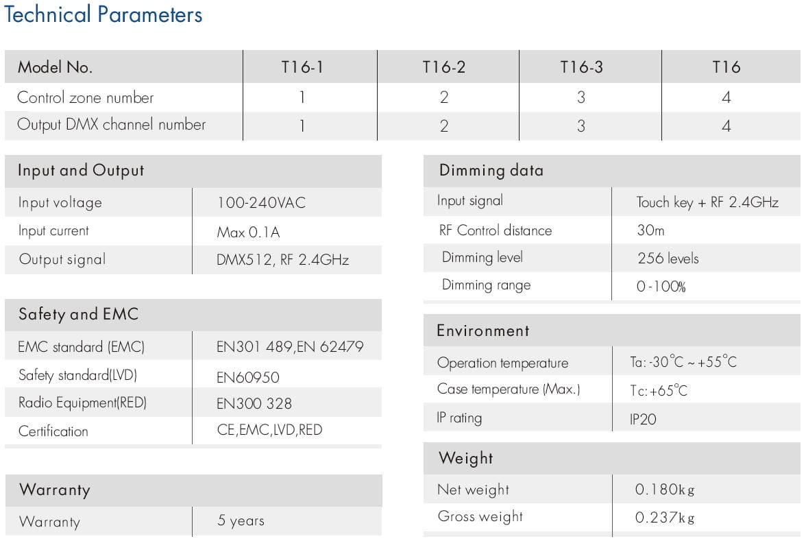 T16(W) Panel RF + DMX512 Ściemniacz Dotykowy 4-Strefowy