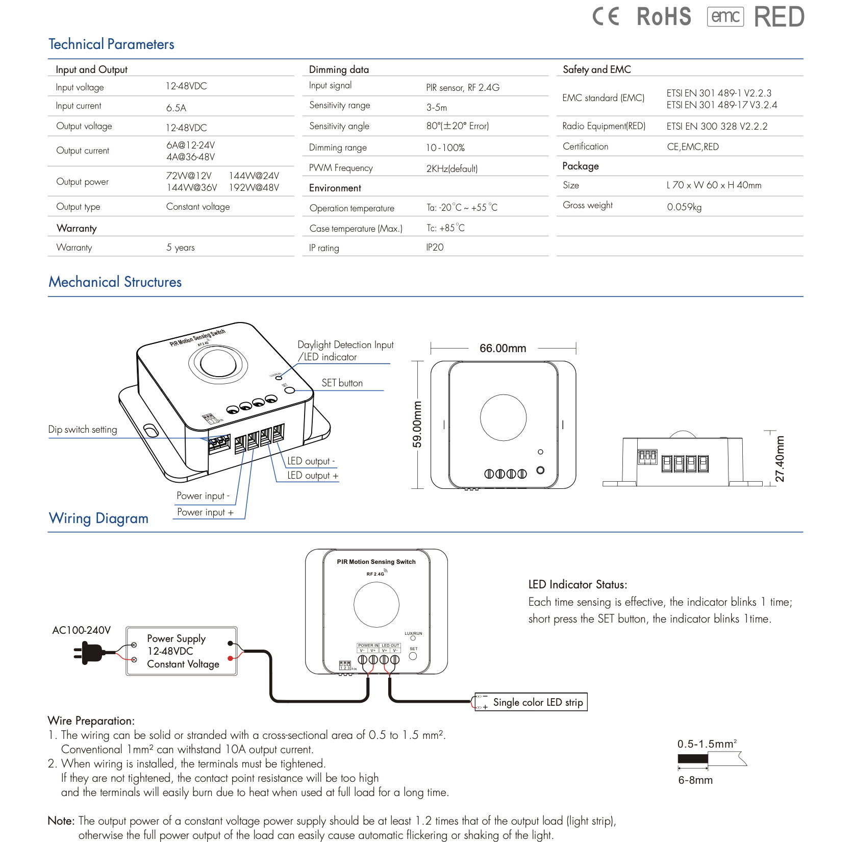 - Zgodność z normami: CE, RoHS.