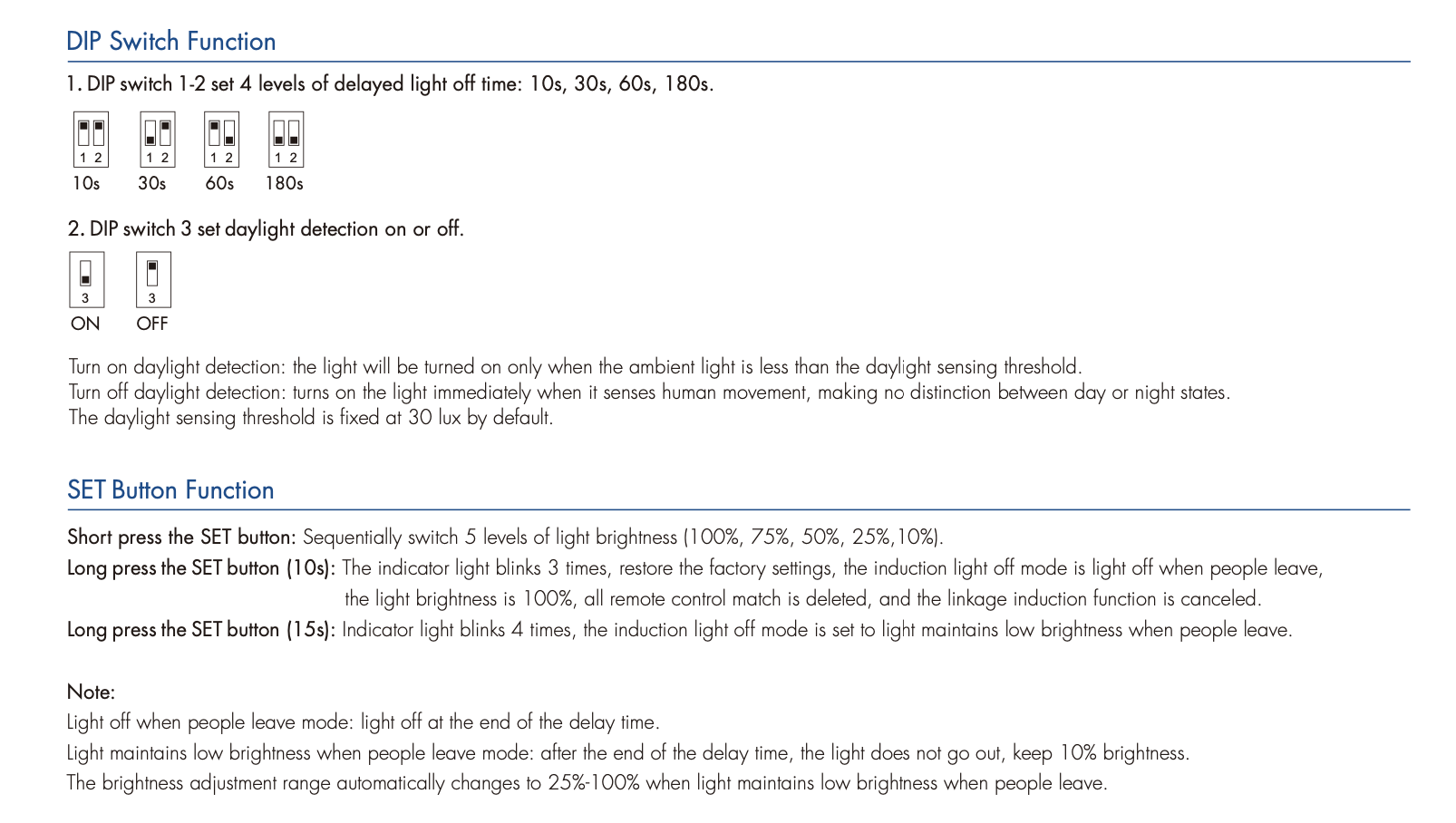 - Dostępne dwa tryby wyłączenia światła: światło gaśnie po opuszczeniu strefy przez osoby lub utrzymuje niską jasność po ich odejściu