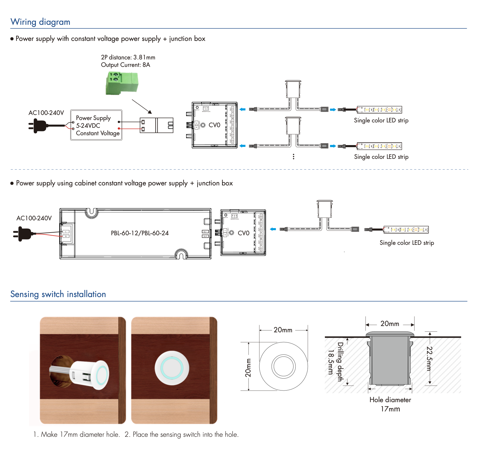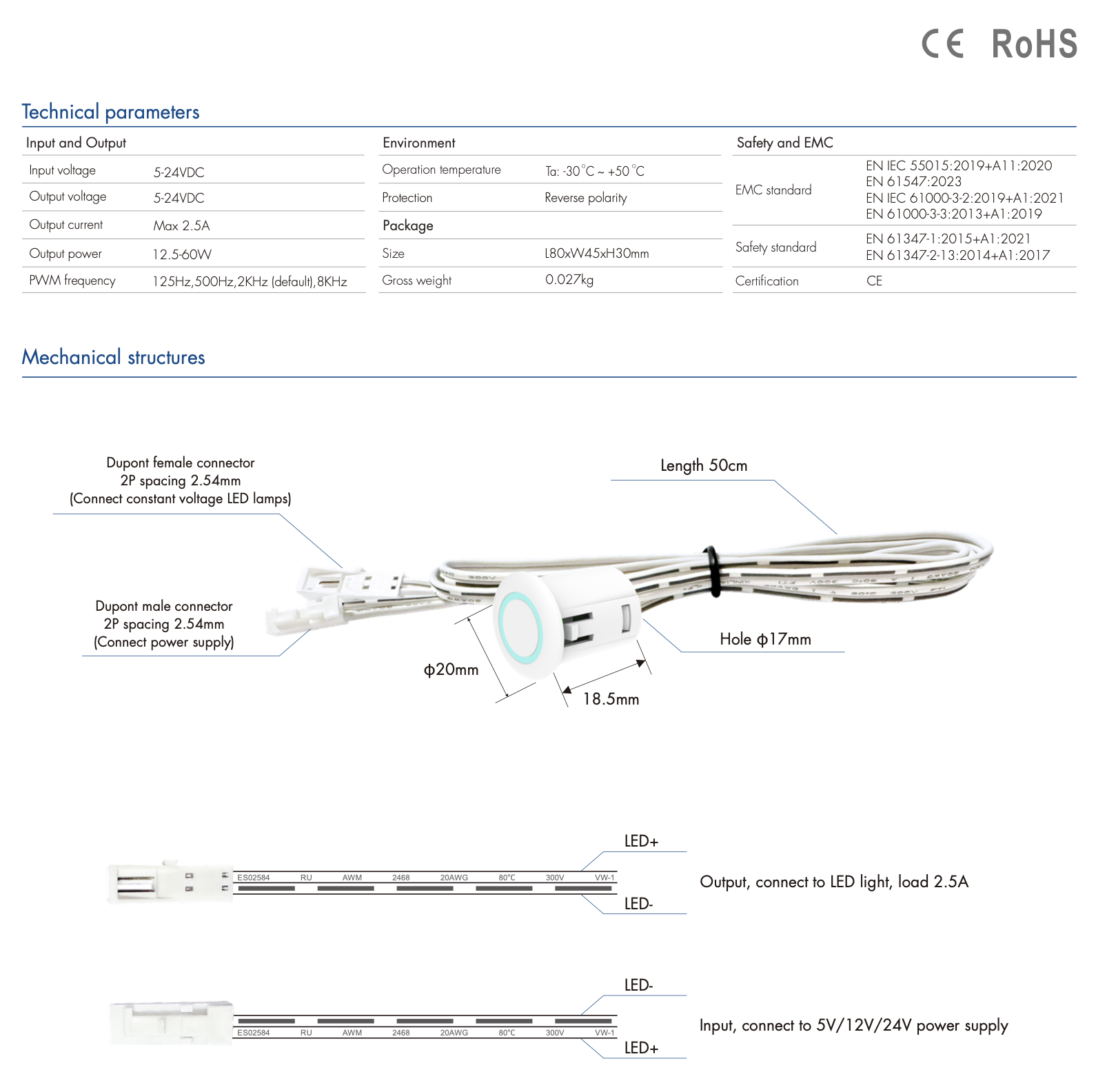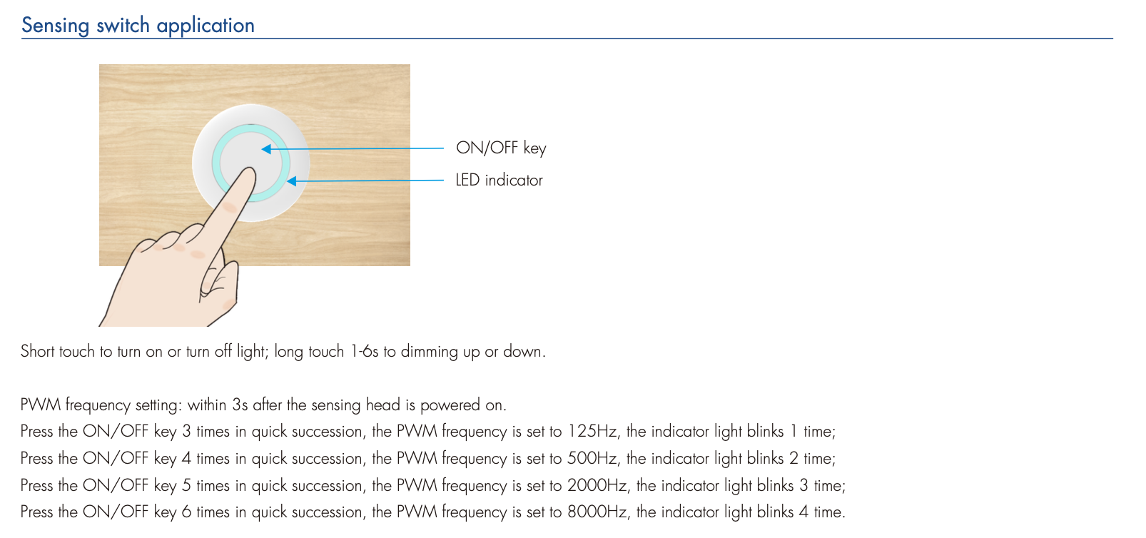 - Ukryty przełącznik dotykowy, wyjście napięcia stałego, podłączany do taśmy LED o niskim napięciu