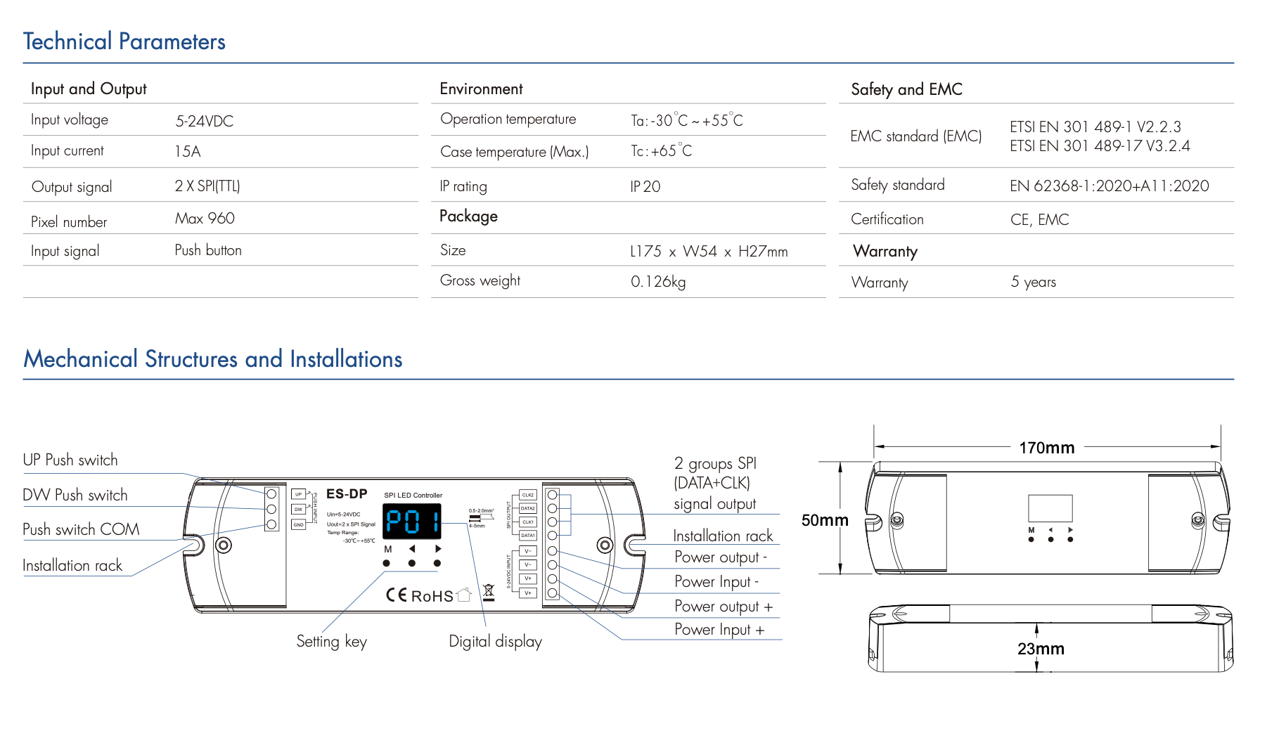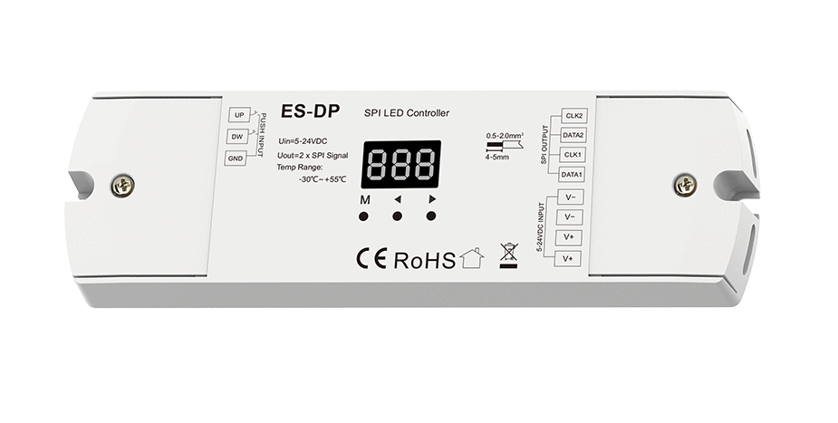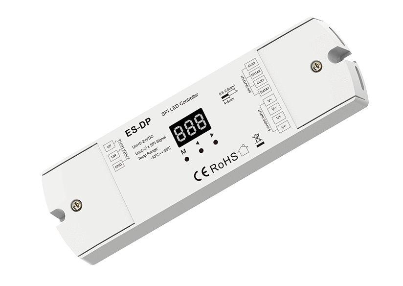 - Dwa wyjścia SPI(TTL) o tym samym sygnale, obsługuje 28 typów IC dla cyfrowych pasków LED RGB lub białego światła, możliwość ustawienia typu IC oraz kolejności R/G/B.