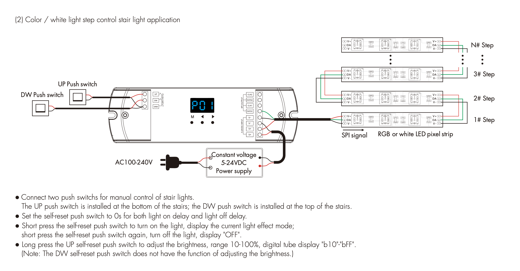 - Gdy jest używany jako oświetlenie schodowe, obsługuje cztery tryby wyjściowe: przepływ kolorów, przepływ bieli, stopniowanie kolorów, stopniowanie bieli
