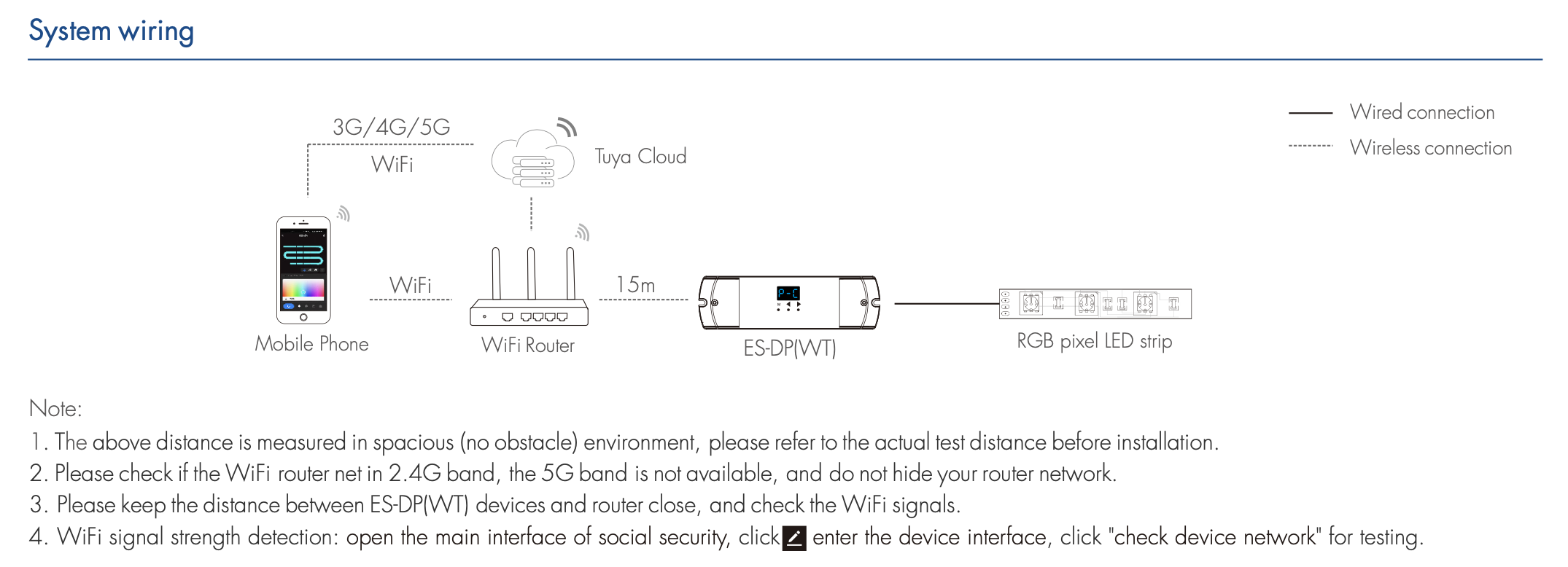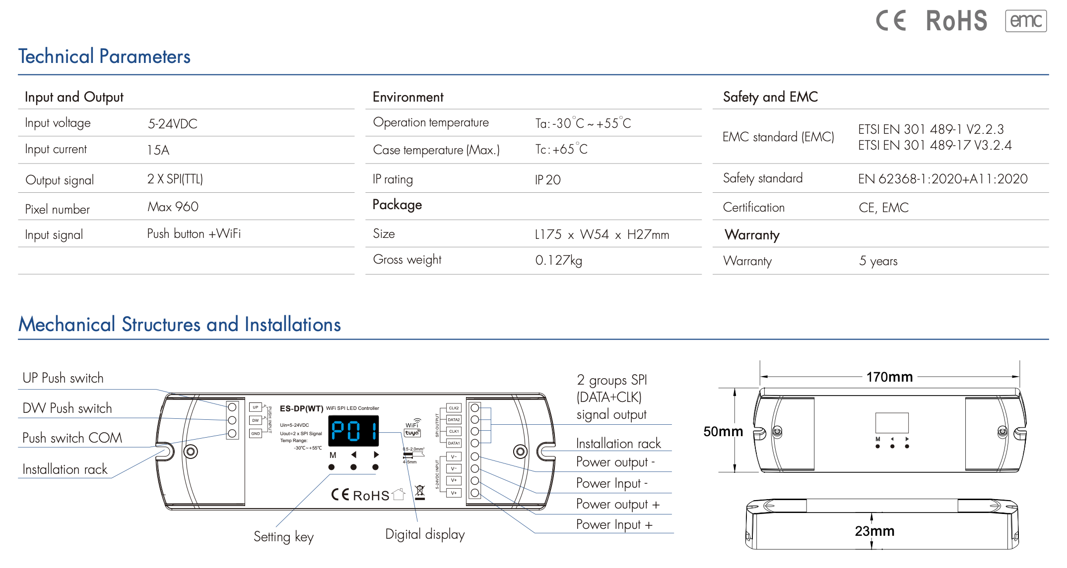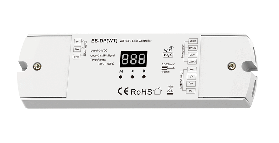 - Dwa wyjścia SPI(TTL) o tym samym sygnale, obsługuje 28 typów IC dla cyfrowych pasków LED RGB lub białego światła, możliwość ustawienia typu IC oraz kolejności R/G/B