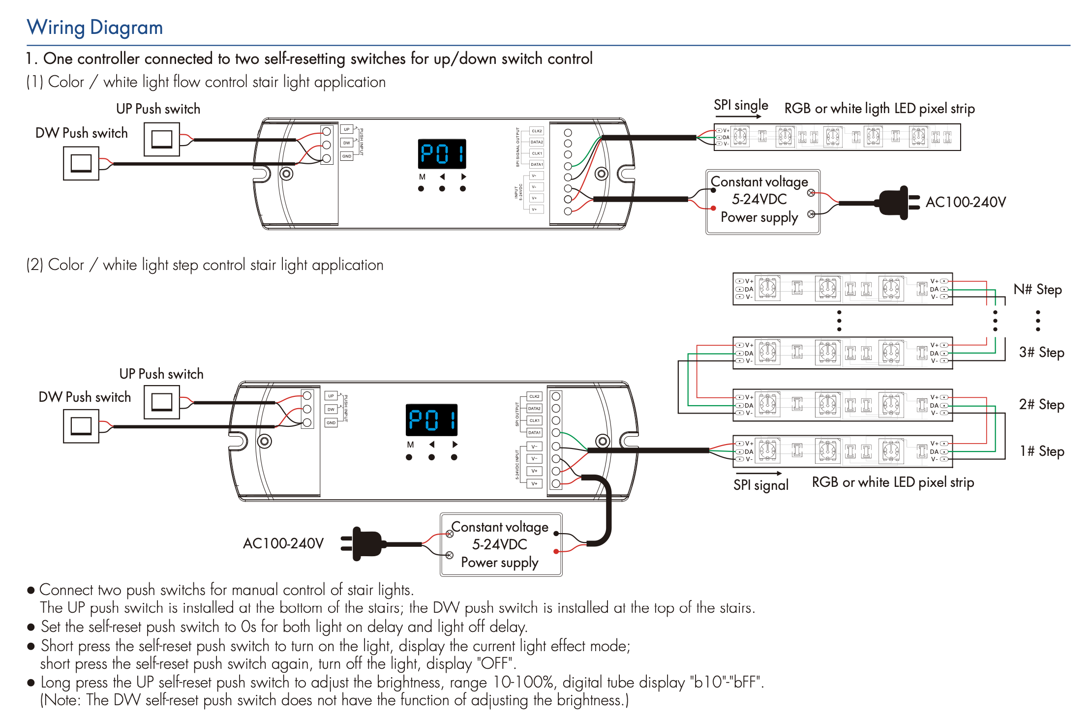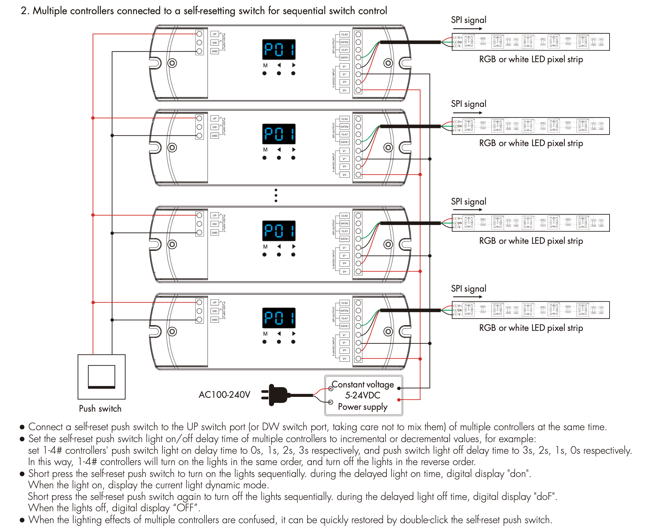 - Możliwość sekwencyjnego przełączania przy użyciu pojedynczego przycisku powrotnego przy podłączeniu kilku sterowników SPI