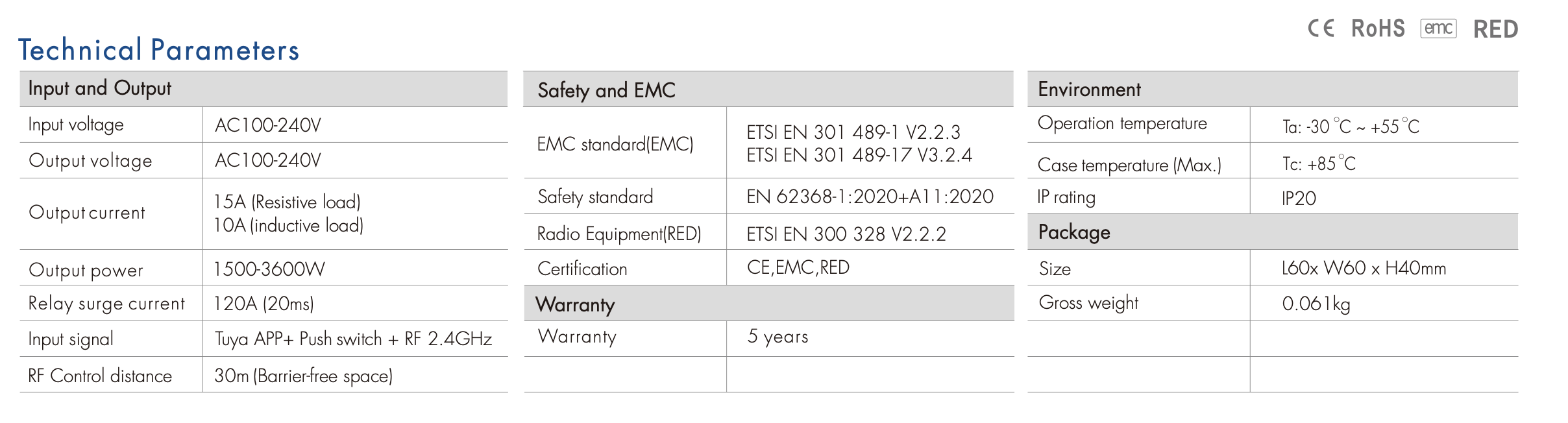 - Sterowanie przez aplikację Tuya, obsługa funkcji włączania/wyłączania, opóźnienia włączania/wyłączania i programatora czasowego