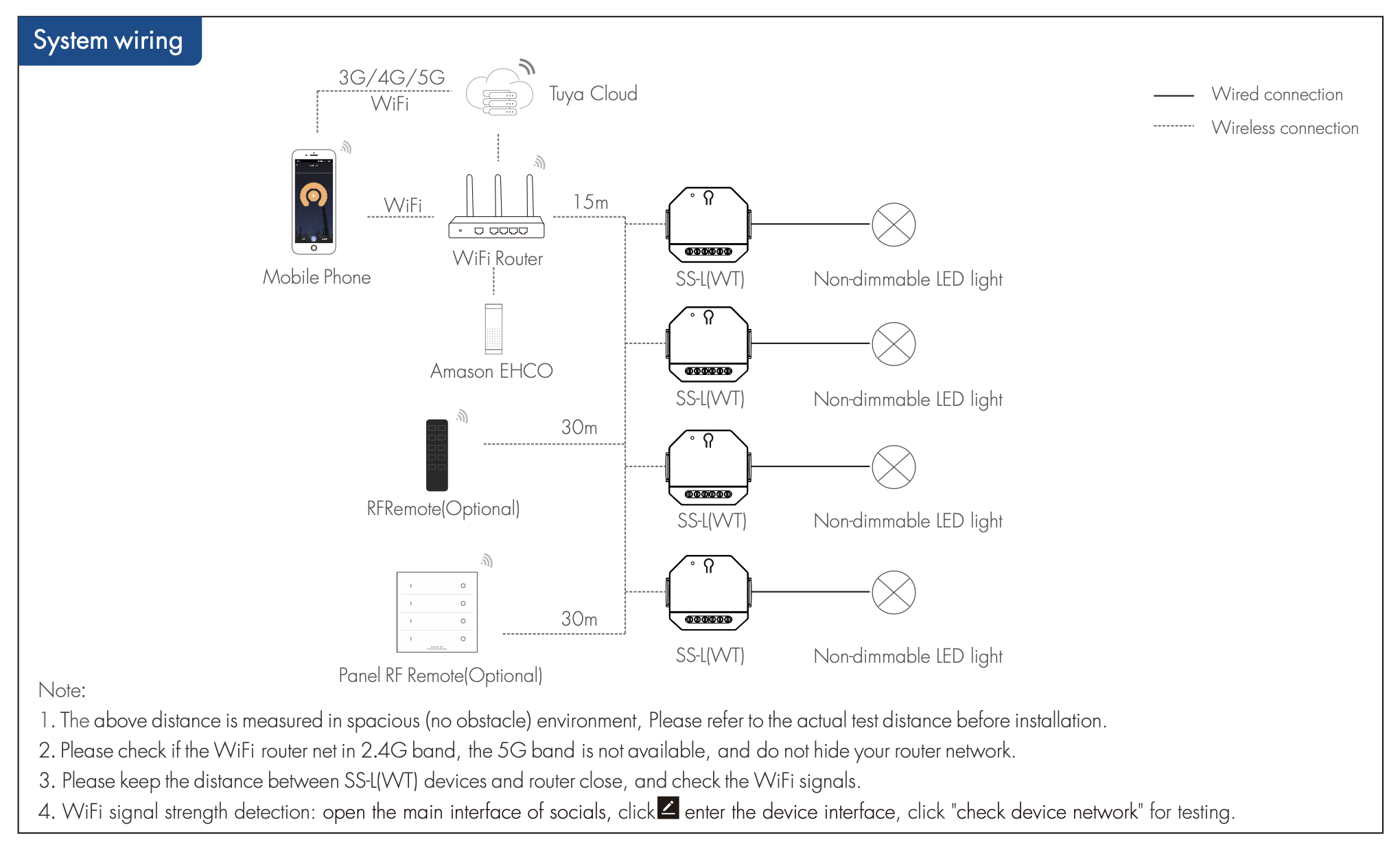 - Każdy kontroler SS-L(WT) może również działać jako konwerter WiFi-RF, umożliwiając użycie aplikacji Tuya do jednoczesnego sterowania jednym lub większą liczbą przełączników lub kontrolerów RF