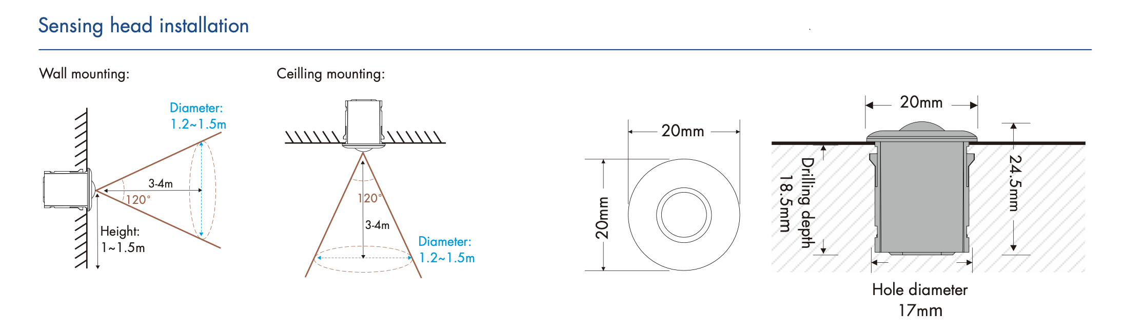- Odległość detekcji głowicy czujnika: 3-4 metry, kąt detekcji: 120°.