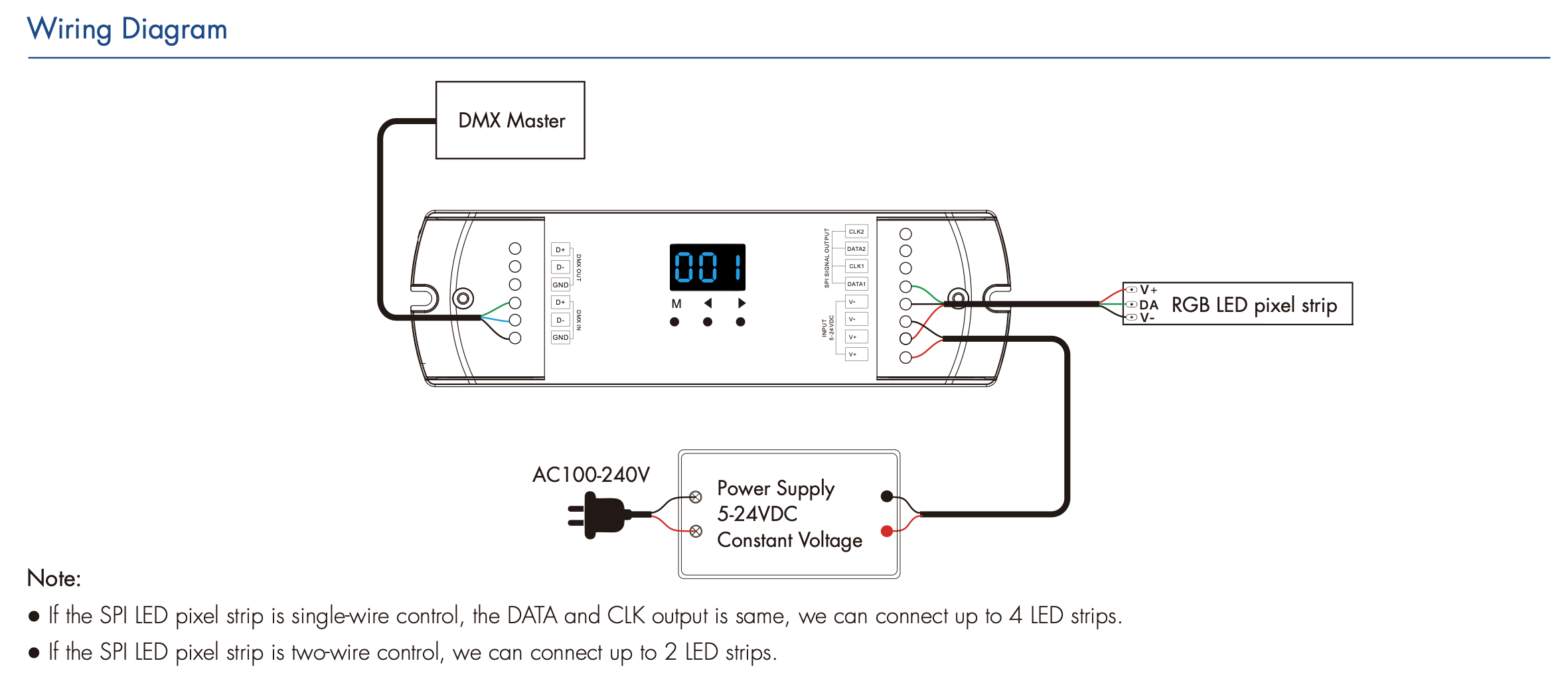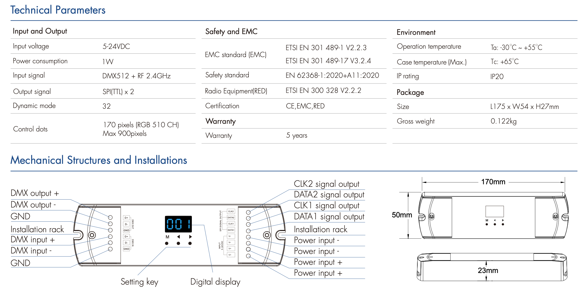 - Kompatybilny z 47 rodzajami cyfrowych pasków LED RGB lub RGBW, z możliwością ustawienia typu IC oraz kolejności R/G/B