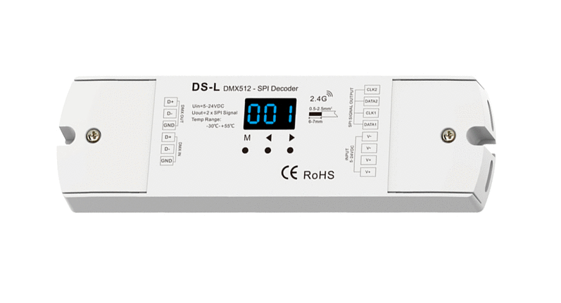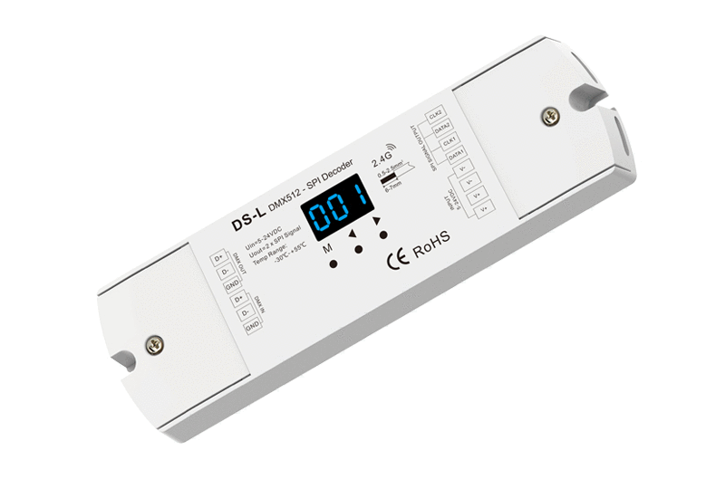 Sterownik DS-L to konwerter sygnału DMX512 do SPI z wbudowanym modułem RF. Zapełnia możliwość sterowania taśmami SPI za pomocą protokołu DMX.