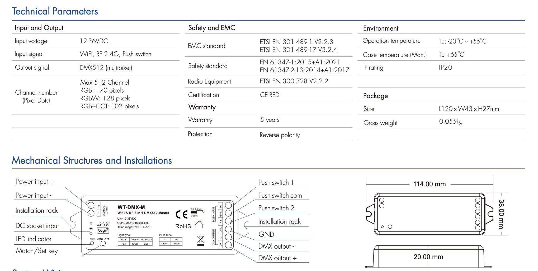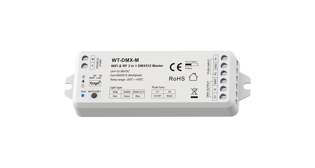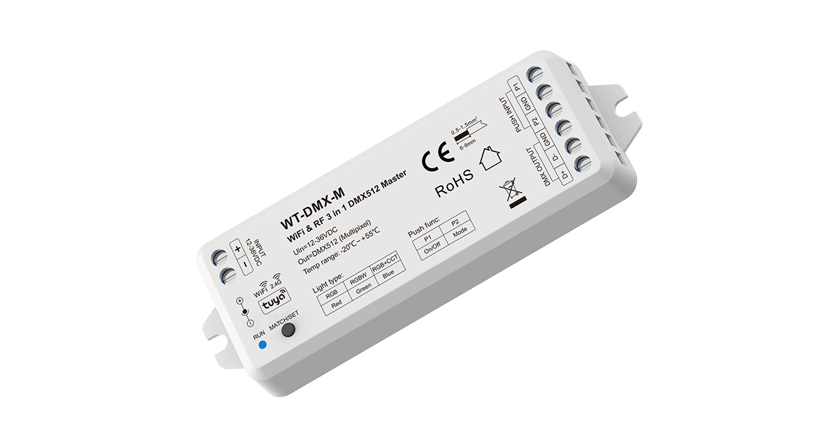 Sterownik WT-DMX-M to konwerter sygnału WiFi&RF do DMX512. Zapełnia możliwość sterowania taśmami RGB/RGBW/RGB+CCT za pomocą protokołu DMX.