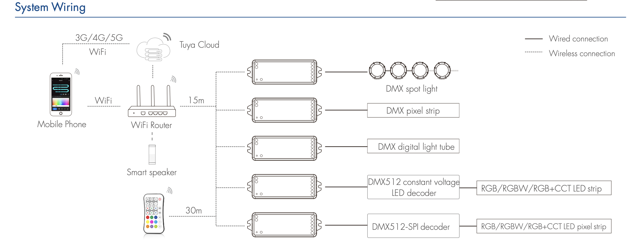 - WiFi i RF RGB/RGBW/RGB+CCT 3-w-1 sterownik DMX512, maksymalnie 512 kanałów wyjściowych