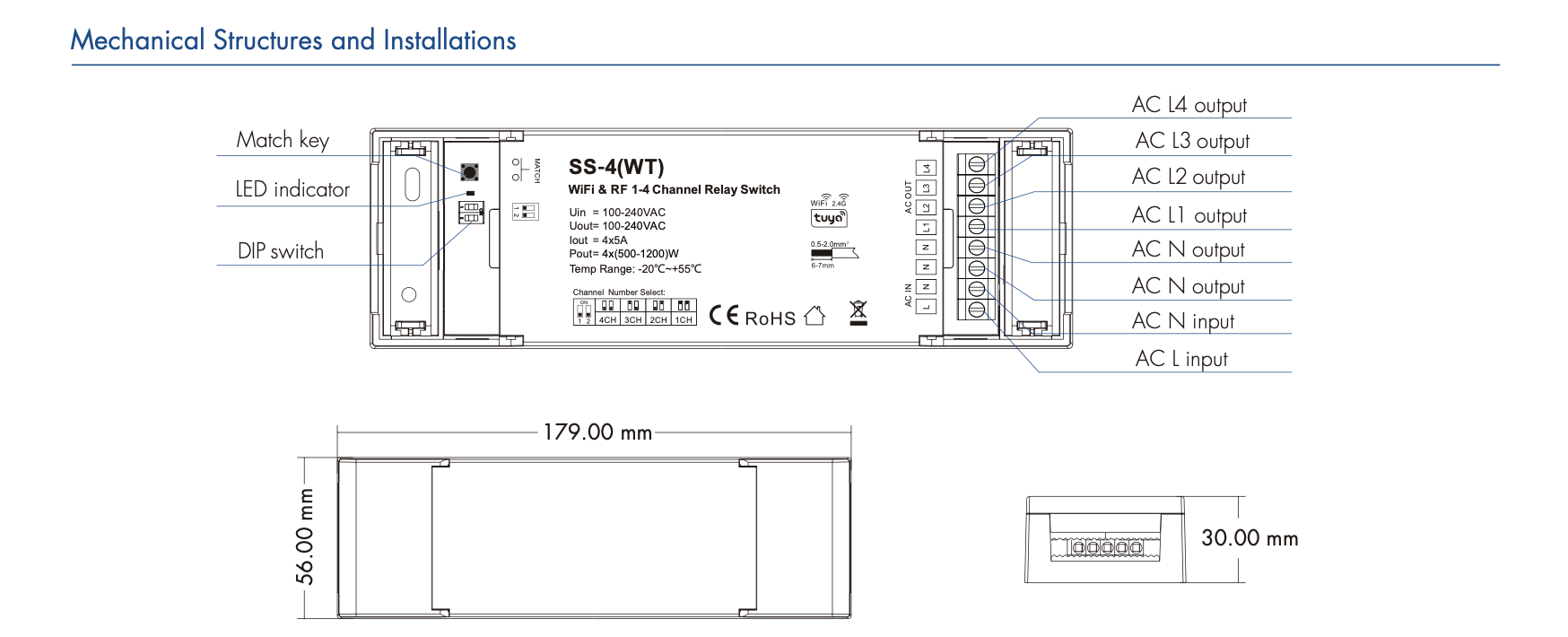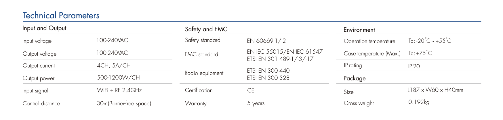 • Wejście wysokiego napięcia AC, 4-kanałowe wyjście przełącznika AC. Prąd wyjściowy na kanał: 5A, maksymalna łączna moc wyjściowa: 1200W