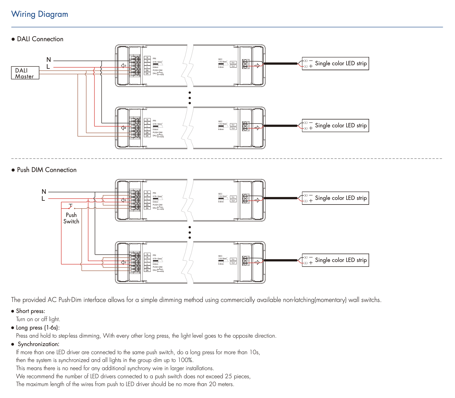 - Interfejs ściemniania: DALI-2, AC Push-Dim
