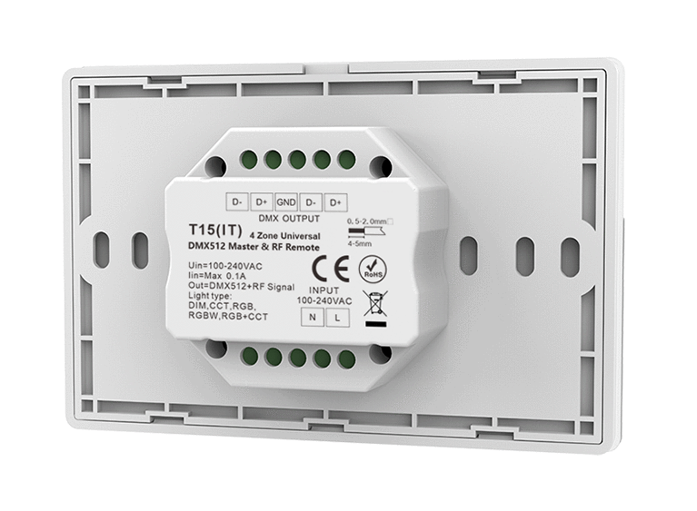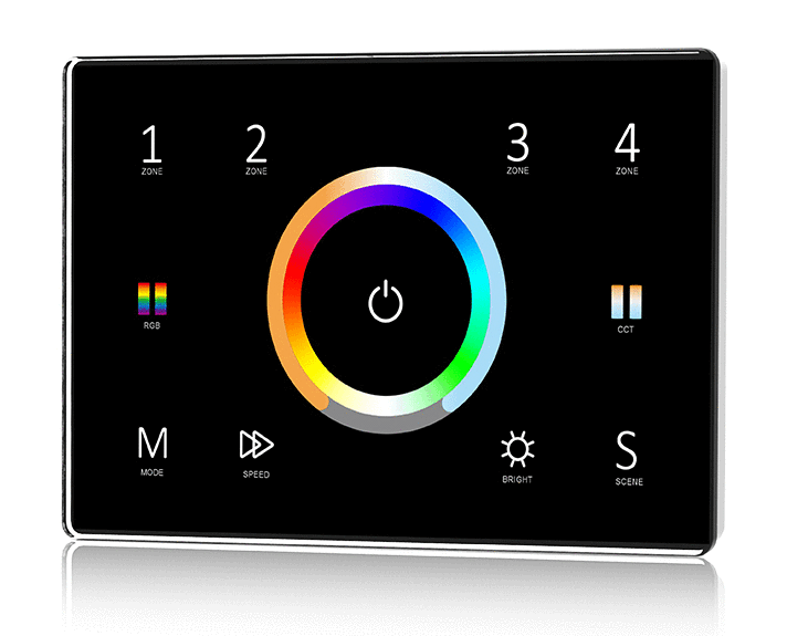 - Panel dotykowy 4 strefowy RGB+CCT DMX512 master, może również być używany jako 4 strefowy RGB+CCT pilot RF