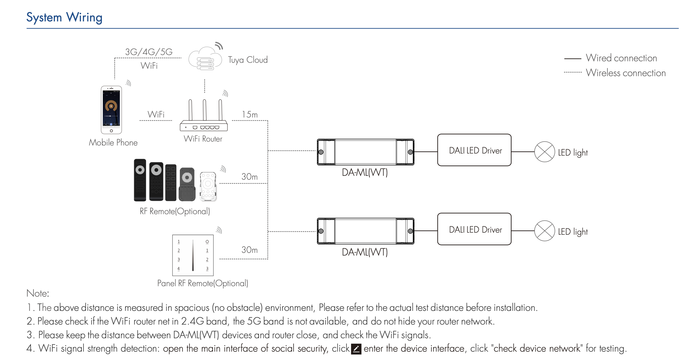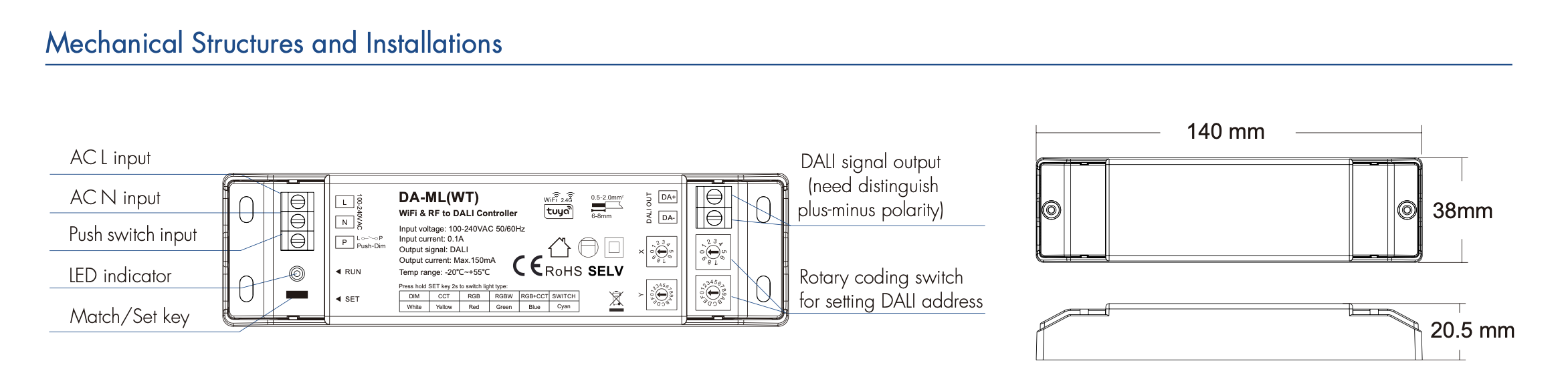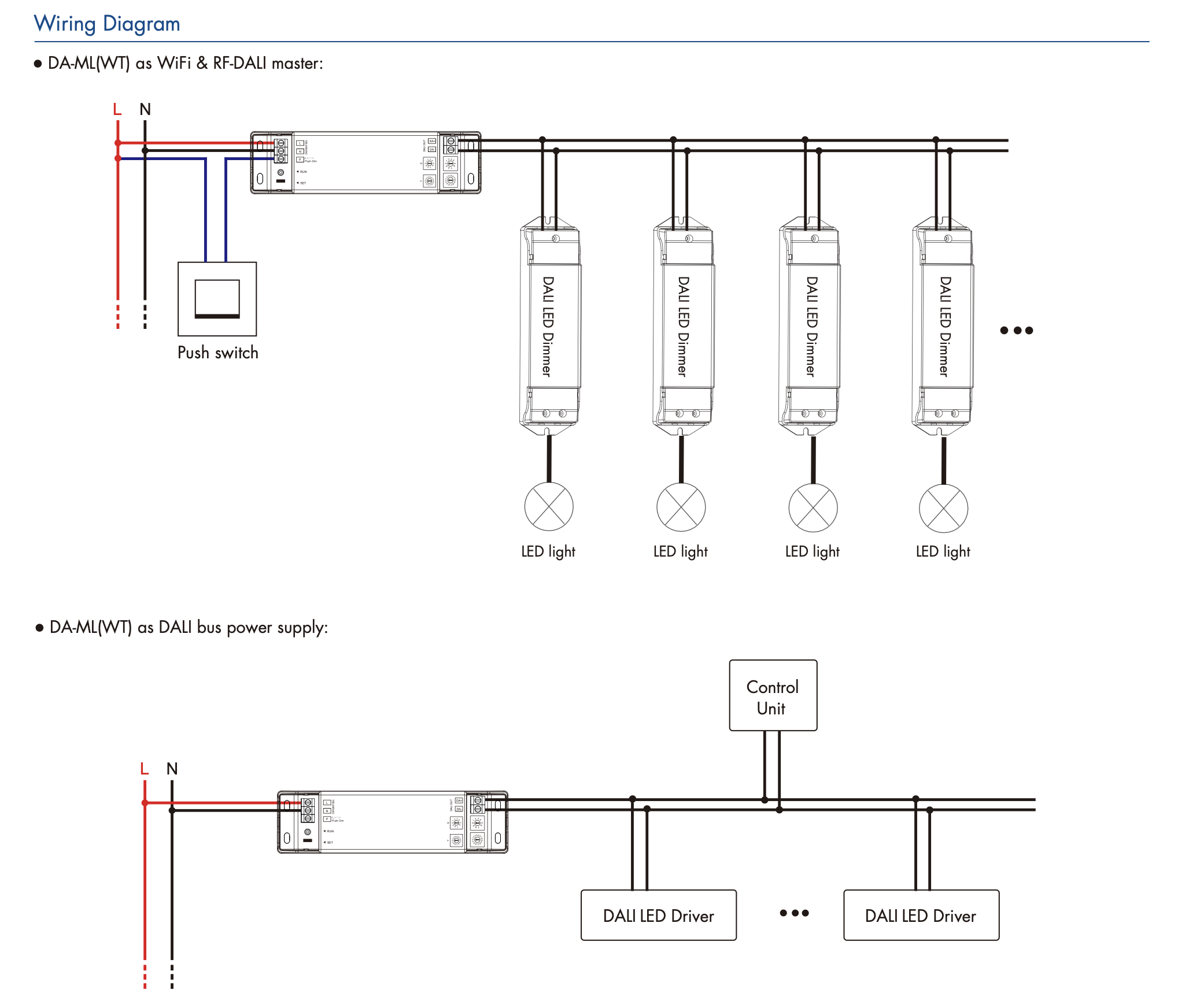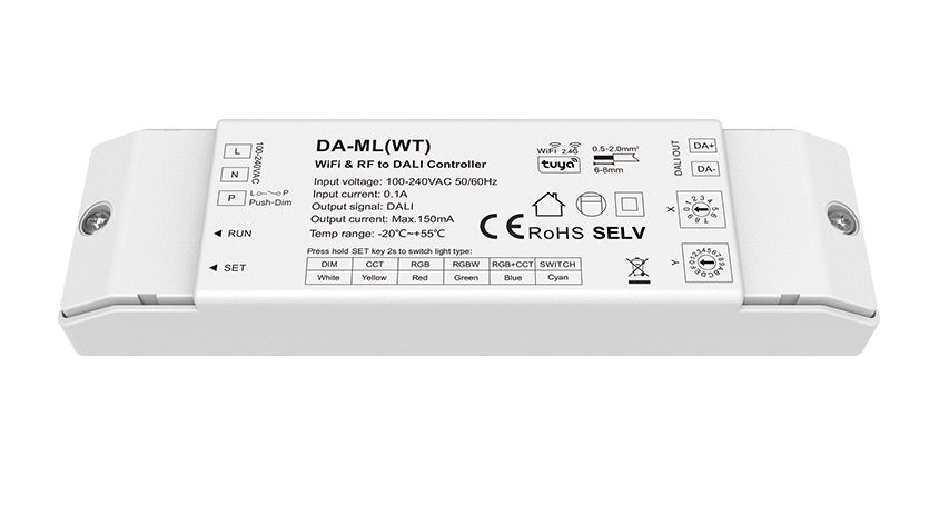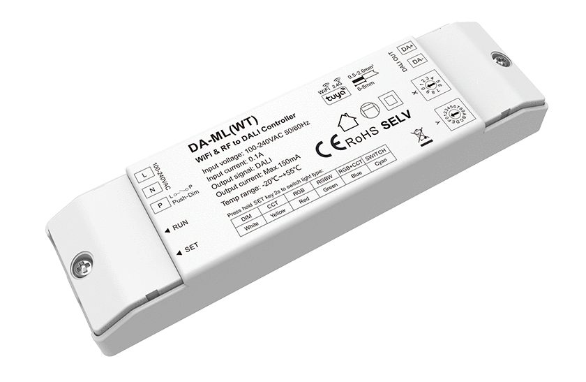 Sterownik DA-ML(WT) to konwerter sygnału RF & WiFi na szynę DALI bus. Zapełnia możliwość sterowania obciążeniem LED oraz taśmami mono/CCT/RGB/RGBW/RGB+CCT.