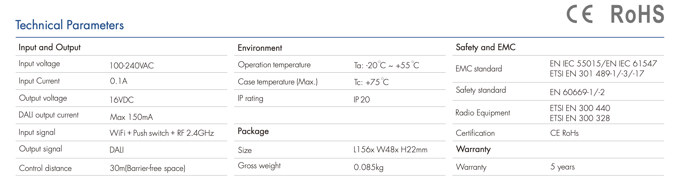 | Rodzaj sterowania | Radio RF & WiFi to DALI |