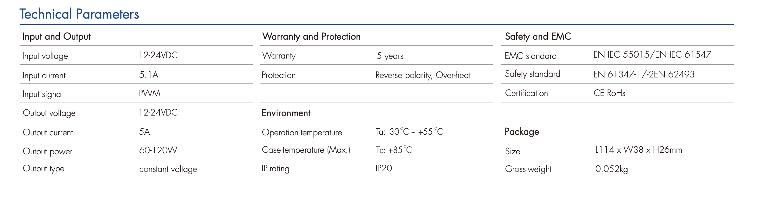 - Zabezpieczenie: Odwrotna polaryzacja, Przegrzanie, Zwarcie