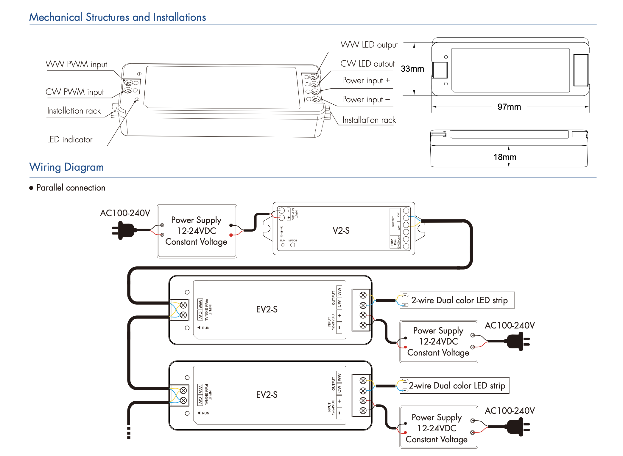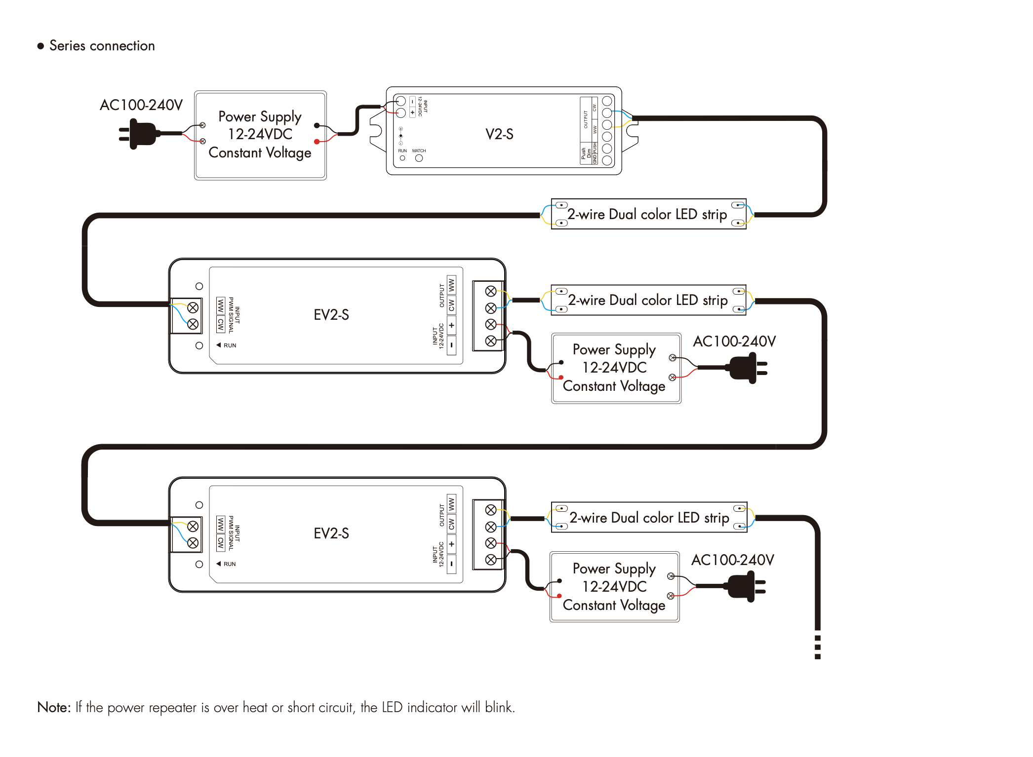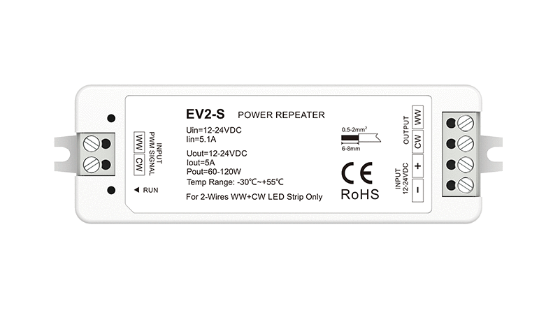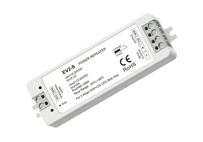 2-wyjściowy wzmacniacz LED EV2-S służy do zwiększenia mocy sterownika CCT 2-wires i umożliwia podłączenie większej ilości taśmy do 1 sterownika.