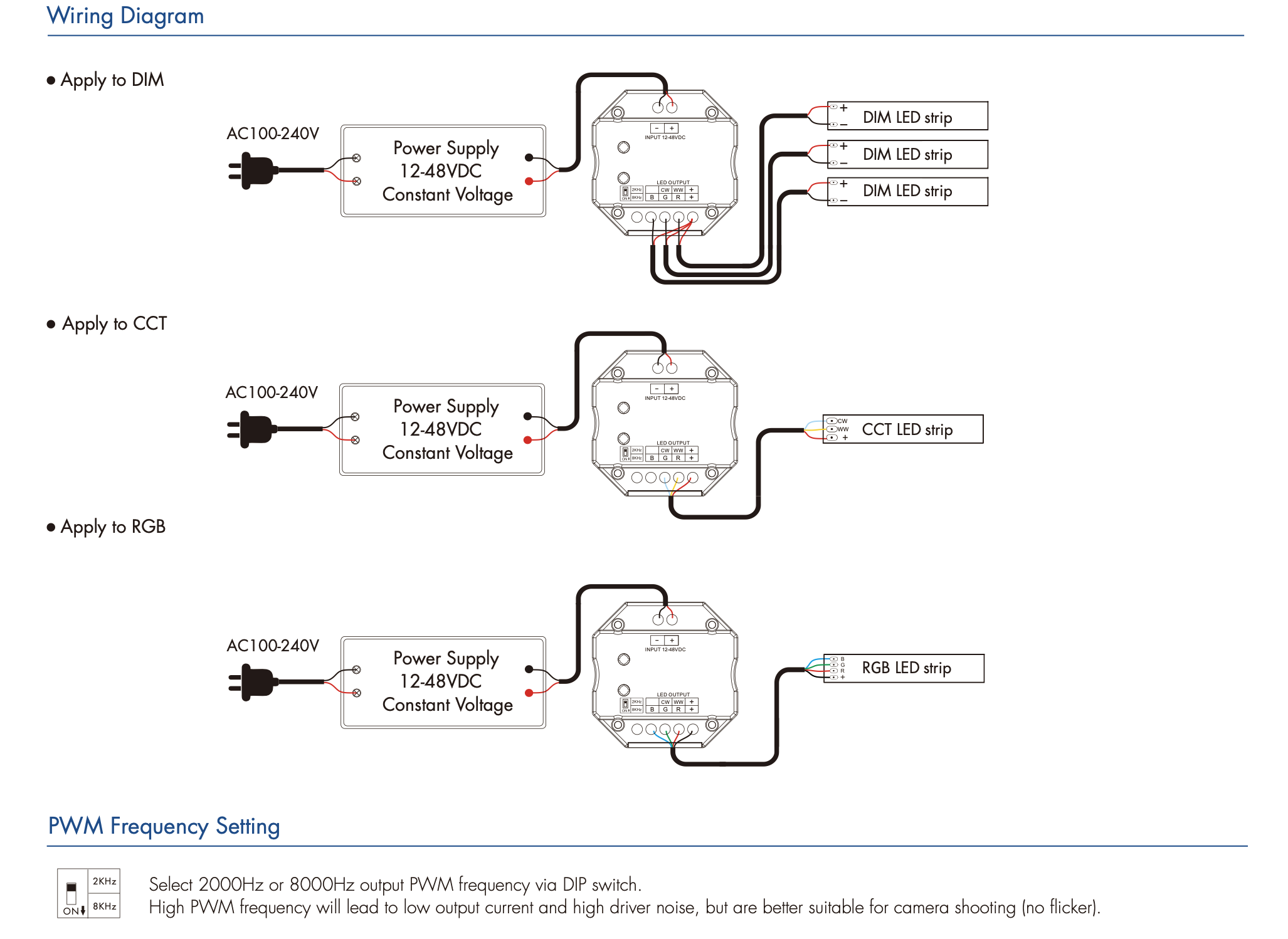 - Może działać jako pilot zdalnego sterowania, wysyłając sygnał RF 2.4G do innych sterowników LED RF lub sterowników ściemniania RF