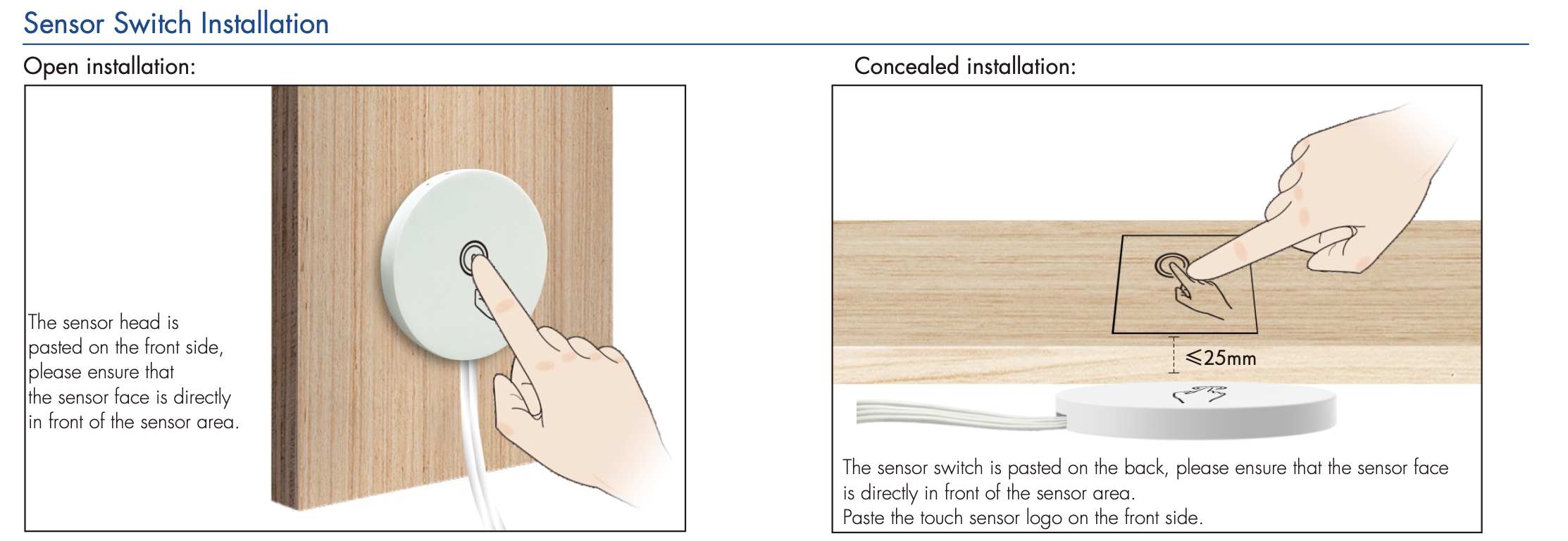 - Możliwość ustawienia 2 poziomów czułości dotyku (0–1 cm dla montażu otwartego, 3–4 cm dla montażu ukrytego)