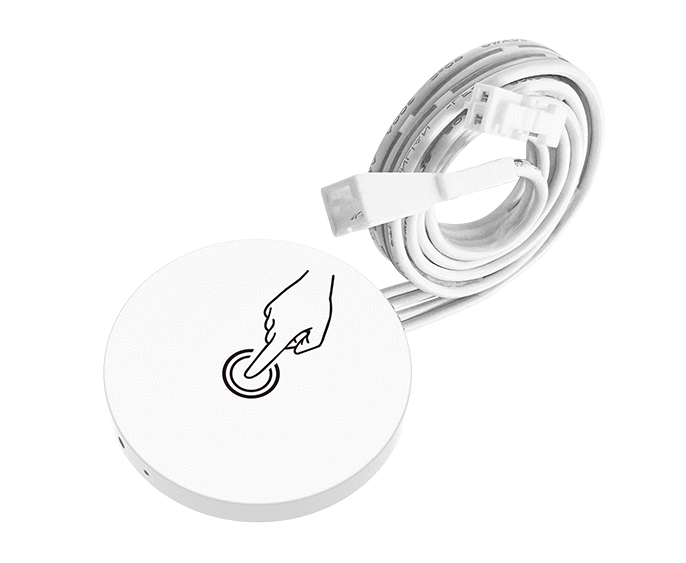 - Włącznik dotykowy do naklejenia w dowolnym miejscu, zasilanie 5–24VDC, wyjście podłącza się do taśmy LED niskiego napięcia