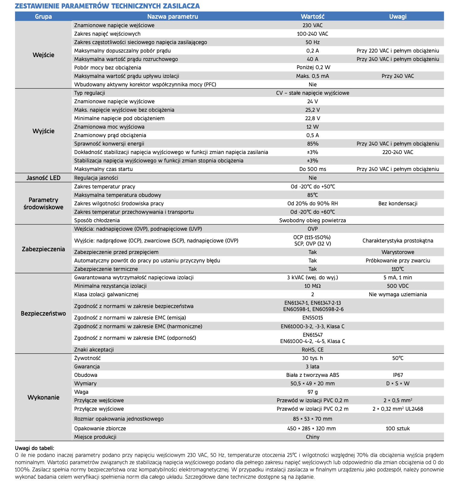 Zasilacz LED dopuszkowy IP67 24V 12W LP-1224 ESPE 5 lat gwarancji