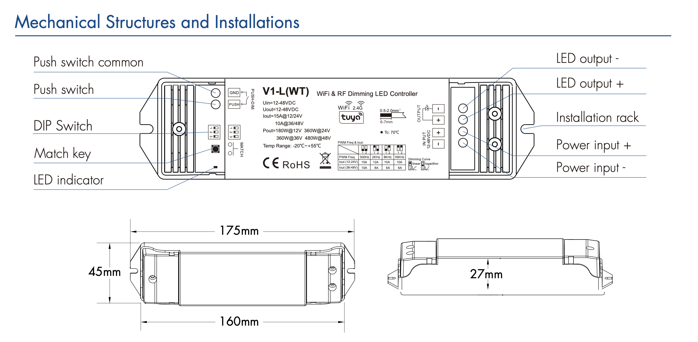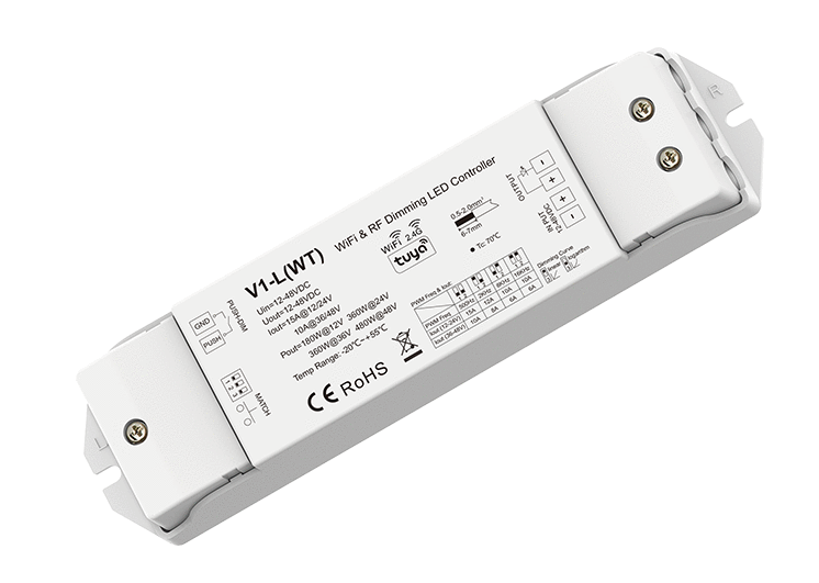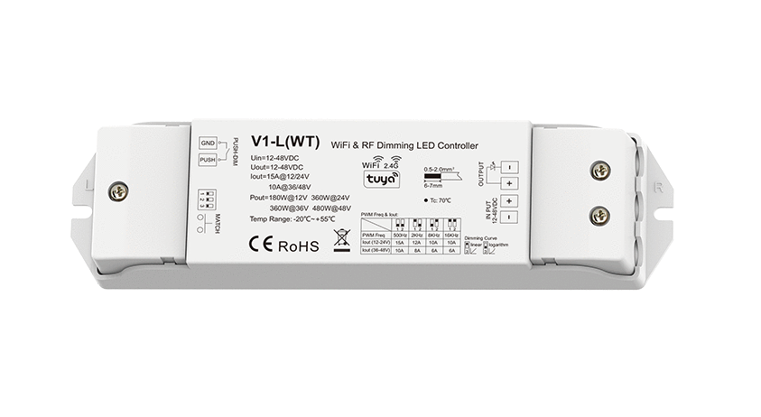 Sterownik-ściemniacz LED V1-L(WT) służy do zarządzania natężeniem światła emitowanego przez jednokolorową taśmę LED przy pomocy radio RF 2.4G oraz WiFi (aplikacja Tuya) oraz Push-Dim (przycisk mono-stabilny).