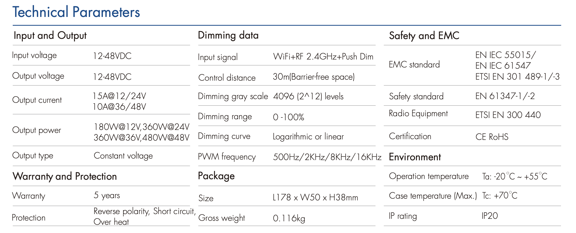 • Kompatybilny z pilotem RF 2.4G do ściemniania w jednej lub wielu strefach