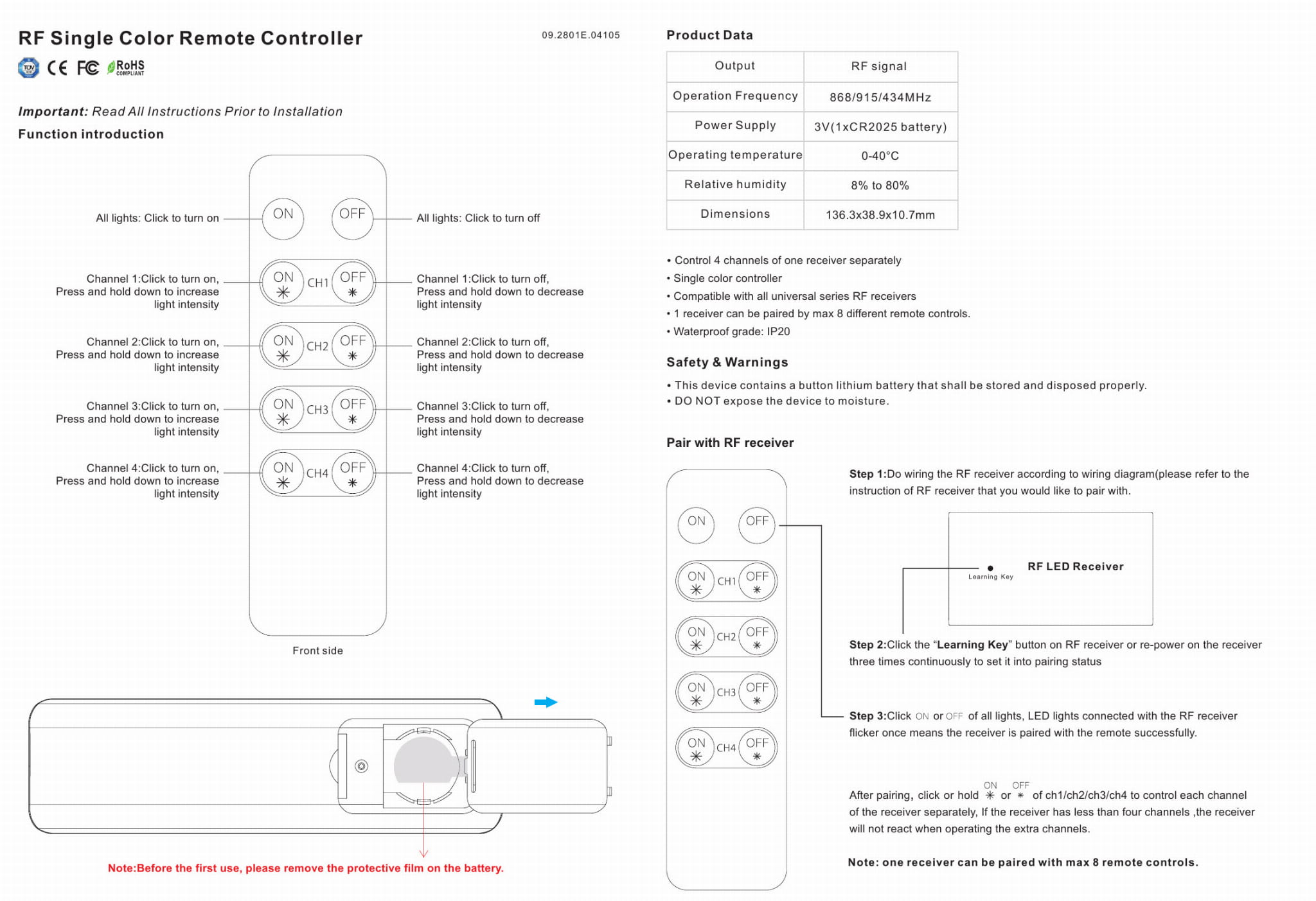 - Możliwość parowania do 8 pilotów radiowych z jednym kontrolerem SR-2501N. Daje to możliwość sterowania jednym kontrolerem z kilku różnych lokalizacji.